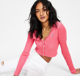Tommy Jeans Women's Ribbed Cropped Cardigan Pink Size Medium
