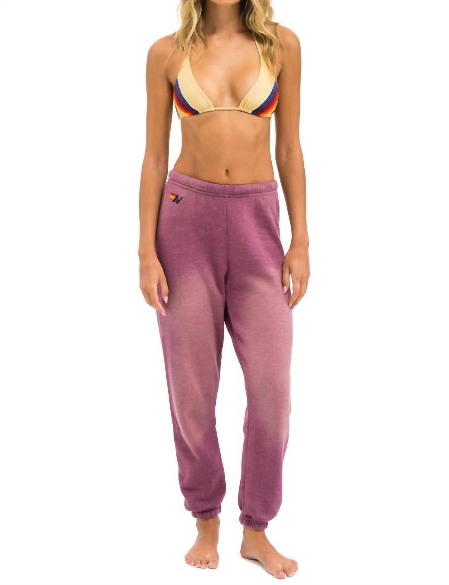 The perfect pant for running around town and looking cool while doing it. Discover the ultimate in comfort with the Bolt Stitch Sweatpants by Aviator Nation, crafted in a trendy Faded Berry hue. These women's graphic sweatpants embody a relaxed fit with a mid-rise and straight leg style, featuring a pull-on closure for easy wear. Expertly sewn in Los Angeles, they boast a tri-blend material composed of 50% polyester, 38% cotton, and 12% rayon. Care instructions recommend machine washing cold with like colors and a choice of hanging dry or using low tumble drying. This seasonal streetwear staple is perfect for travel and embodies a unique, hand-sewn finish.