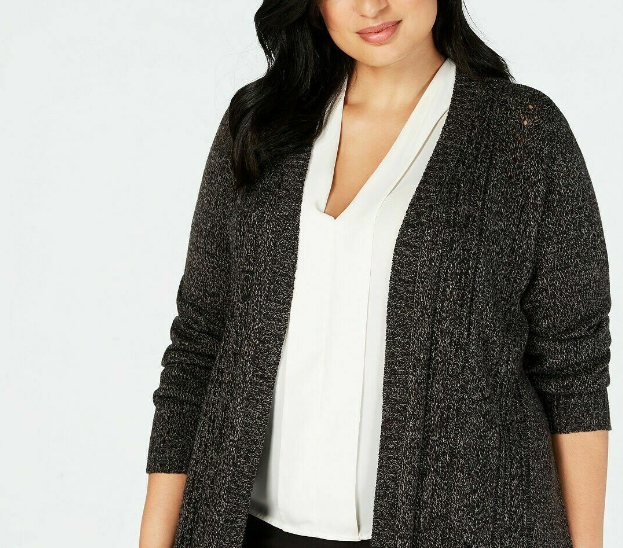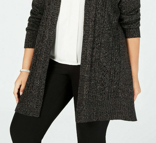Hits below hip|Collarless; open front|Pointelle knit design at front|Acrylic