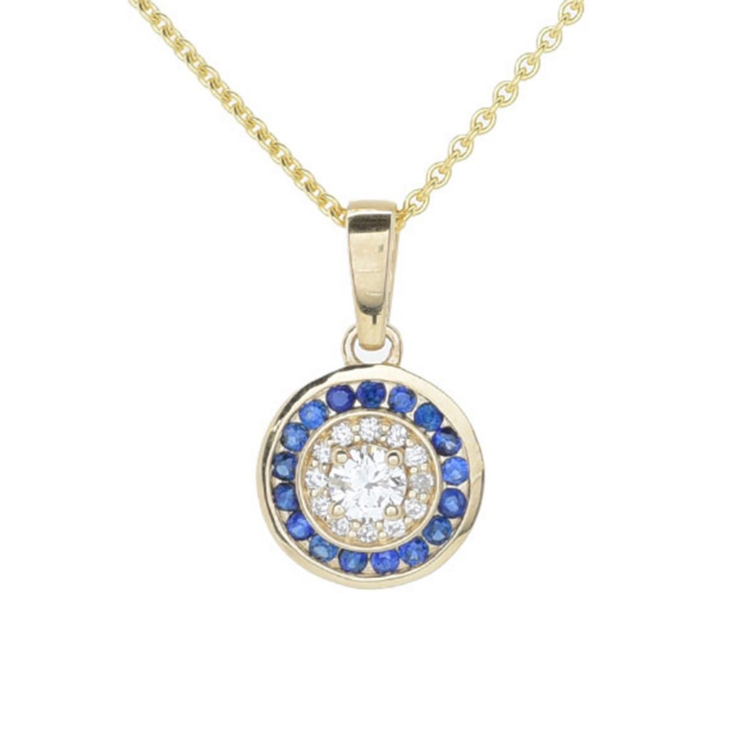 Discover the exquisite elegance of the Gems of Distinction pendant, a masterpiece in the world of jewelry that promises to captivate. Crafted with meticulous attention to detail, this pendant is adorned with a stunning array of diamonds and sapphires, all set in luxurious 14K yellow gold.