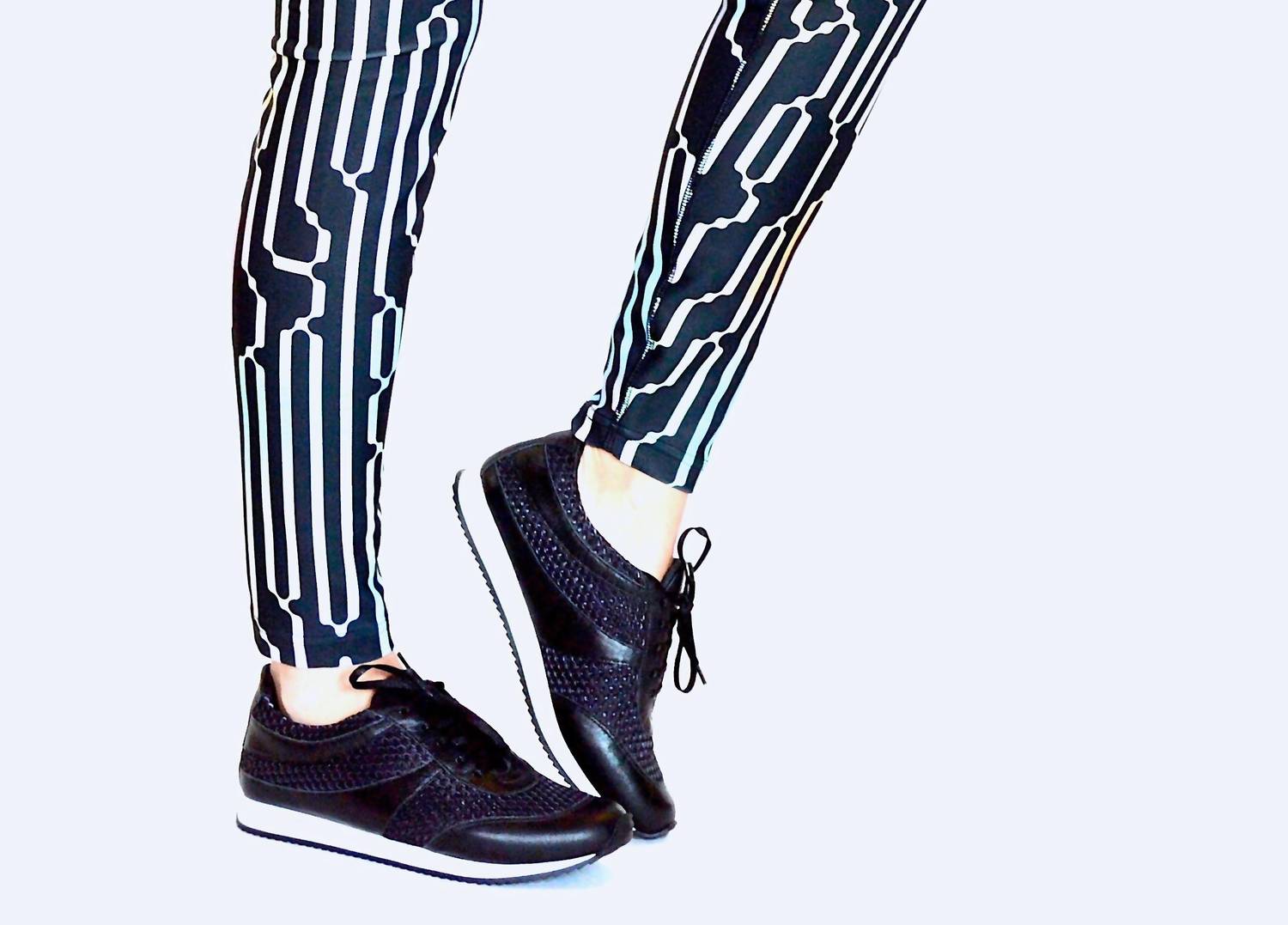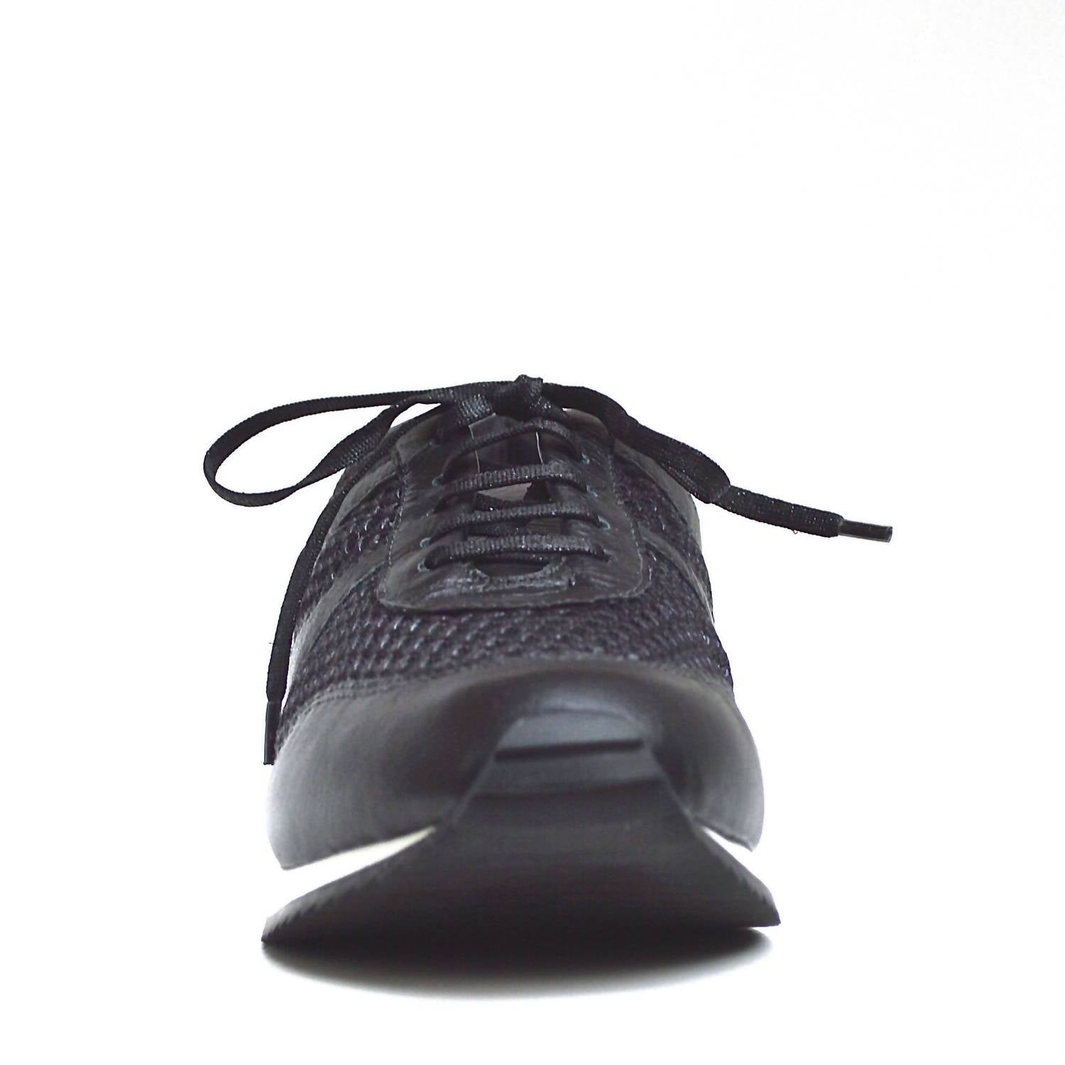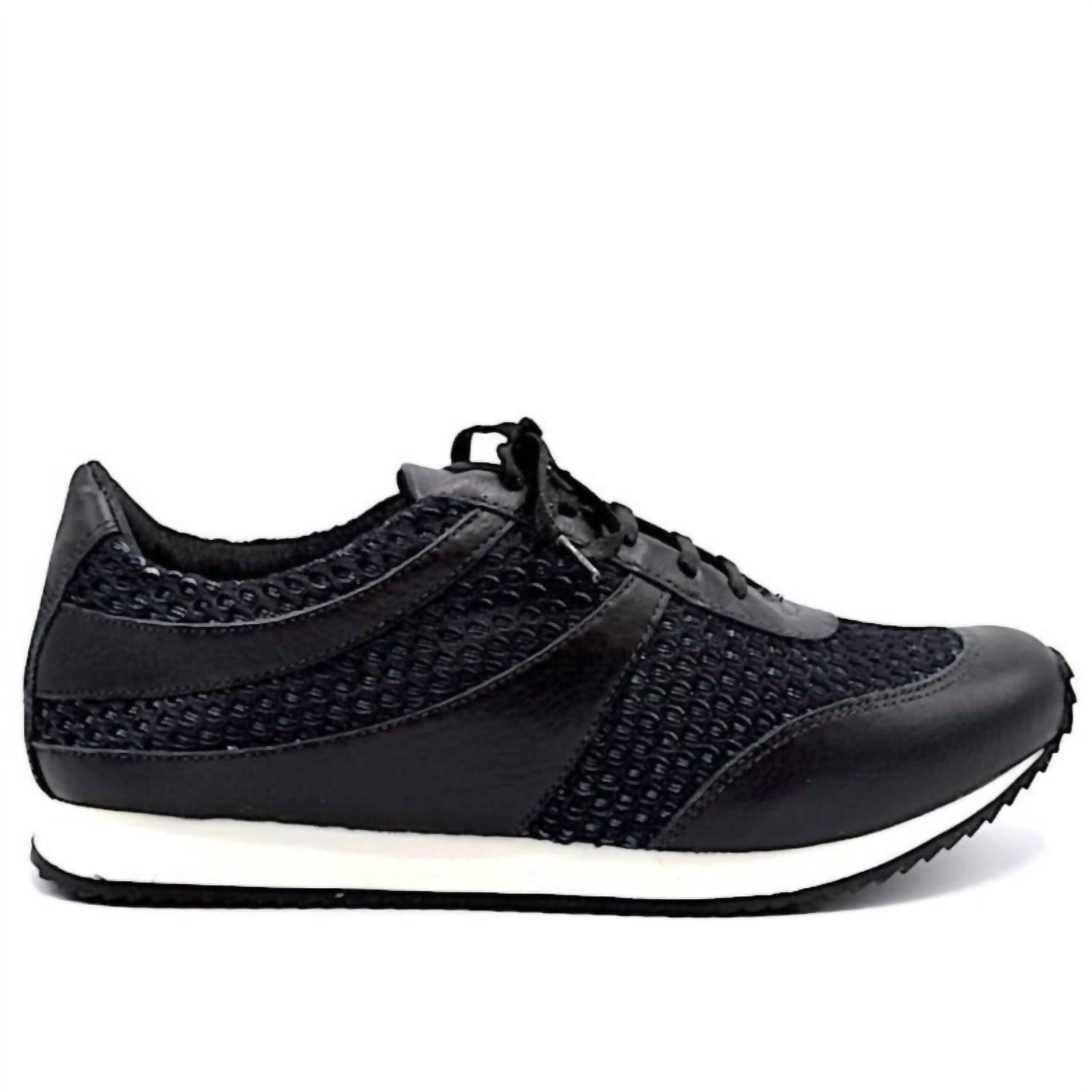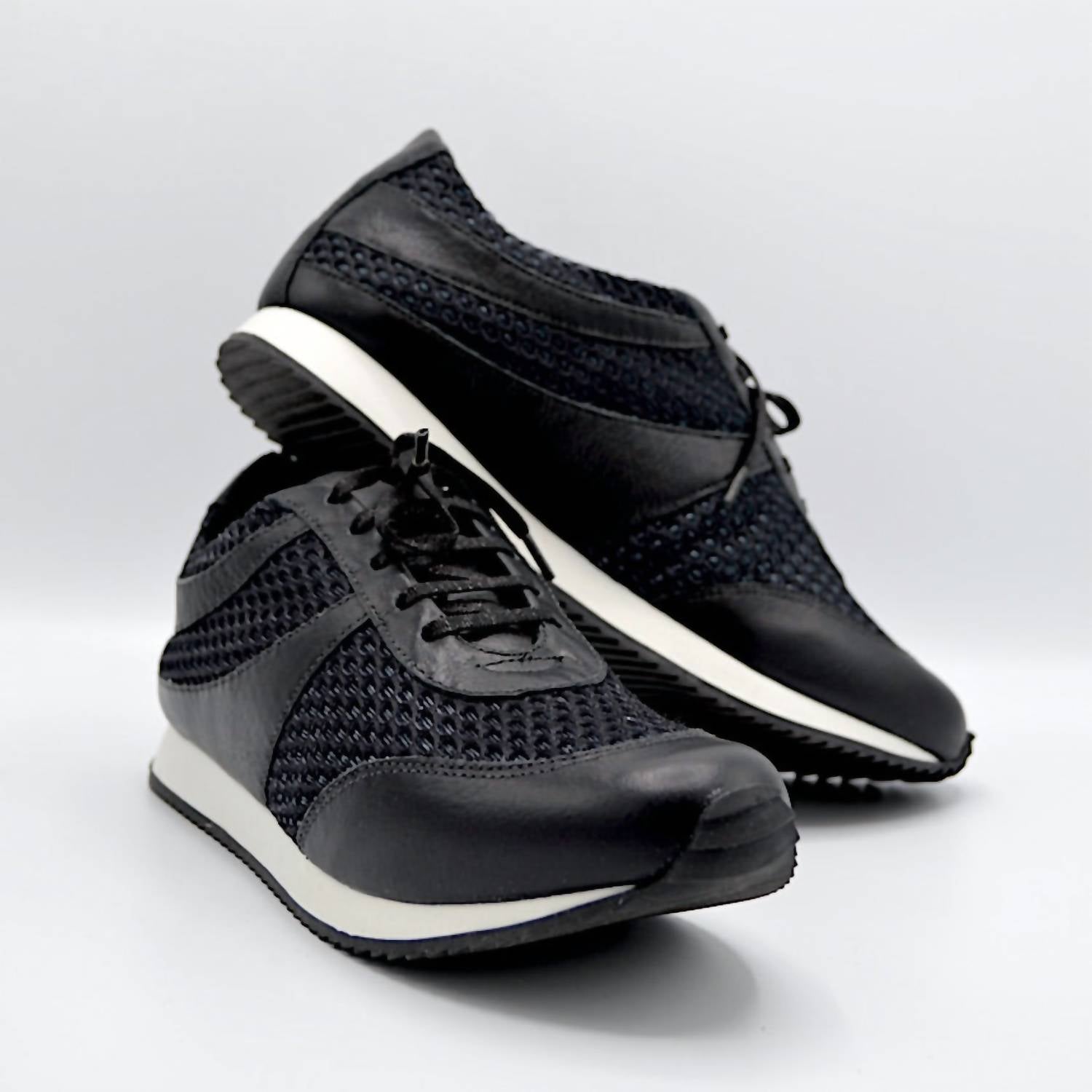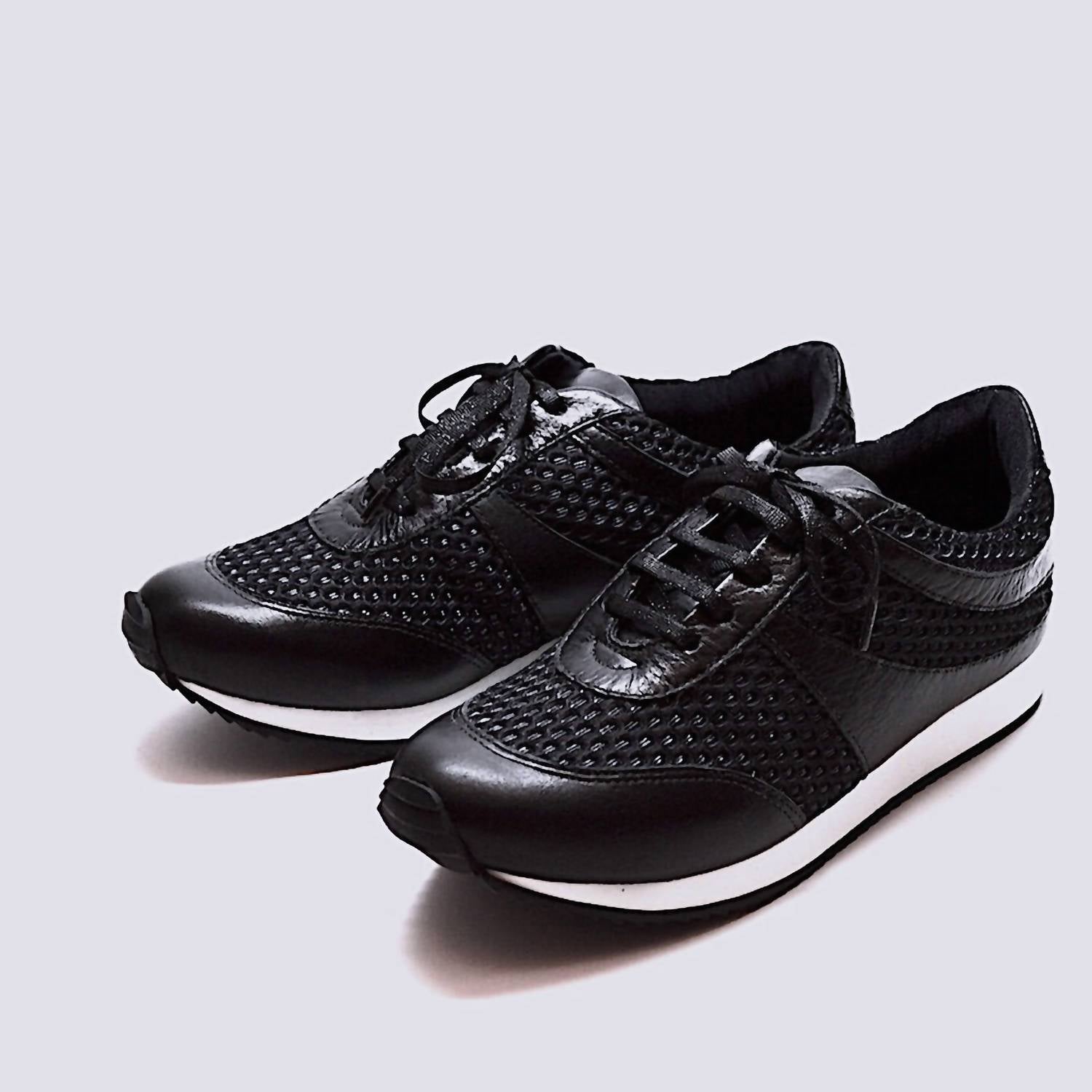 Get your daily steps in with these adorable sneakers. Chelsea Jones presents the Women's Train Walking Shoe, a chic blend of black leather and mesh perfect for athleisure enthusiasts. With a 1" platform, these sneakers are designed with traction rubber soles and flat sparkly laces for both style and functionality. Made in Brazil, the round toe design ensures comfort, ideal for summer fitness or casual occasions. Elevate your workout look with this trendy and functional footwear.
