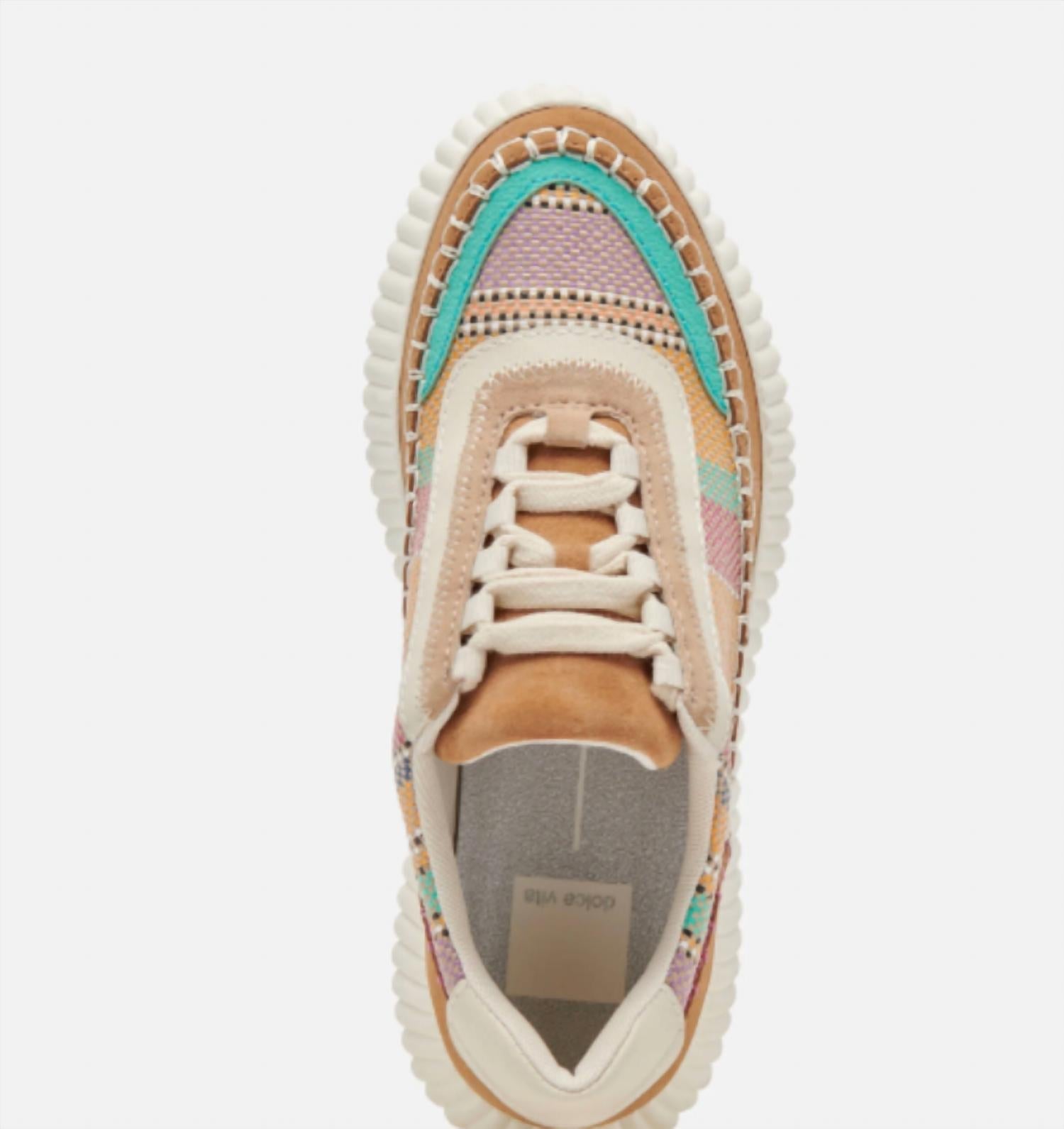 The DOLEN sneaker features a leather and woven knit upper, a 1.6-inch platform sole, and a rubber outsole. It has a sporty lace-up design with a recycled textile lining and synthetic sock. These shoes are imported and designed for casual, all-day wear.