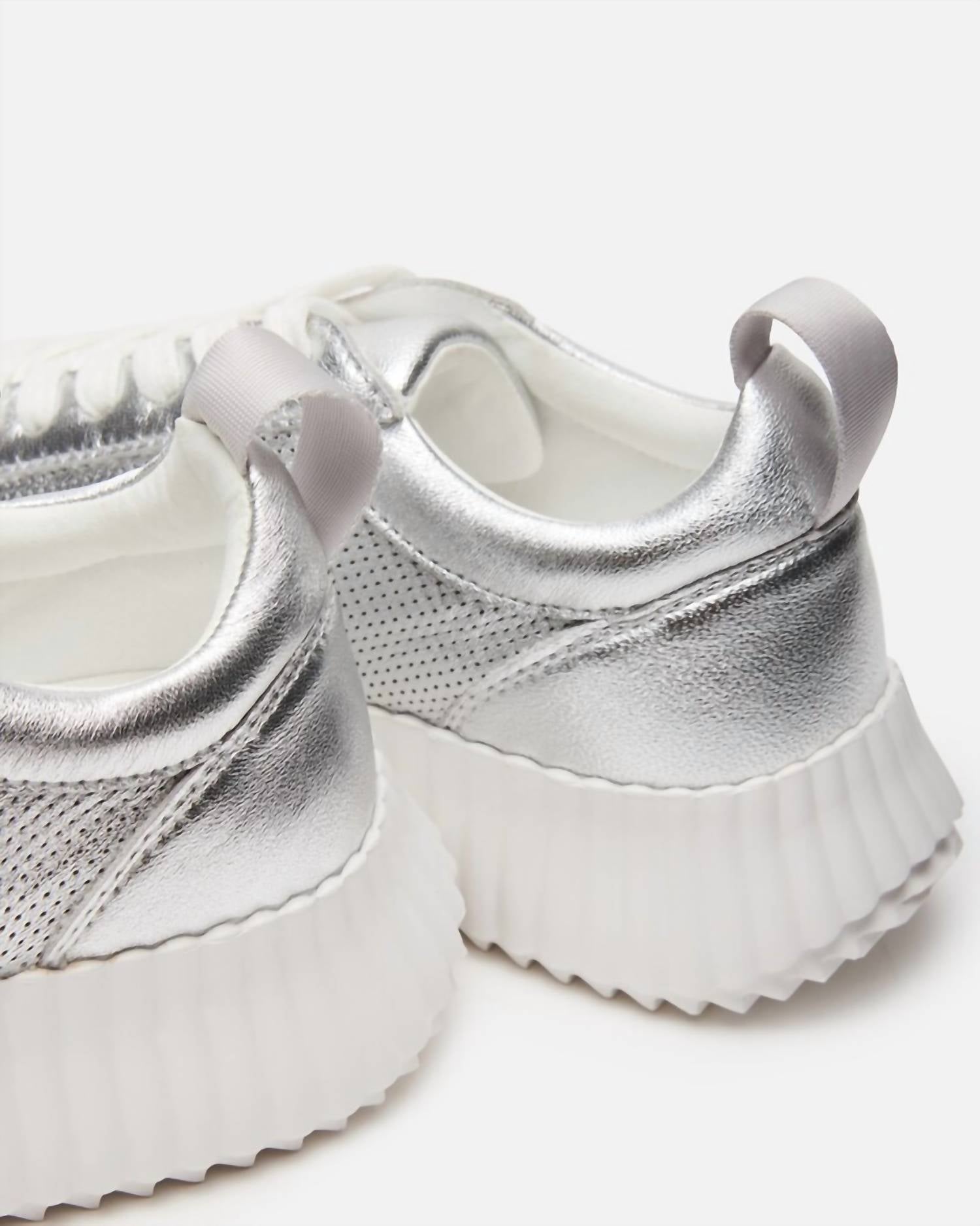Unleash your style with the Women's Shock Jogger Sneakers by STEVE MADDEN in an eye-catching silver hue. Crafted with a leather upper and featuring a micro suede lining, these sneakers offer a perfect blend of style and comfort. The design is highlighted by a chunky, 1.25-inch platform sole with bubbled ribbing texture and perforated upper panel details. Imported.