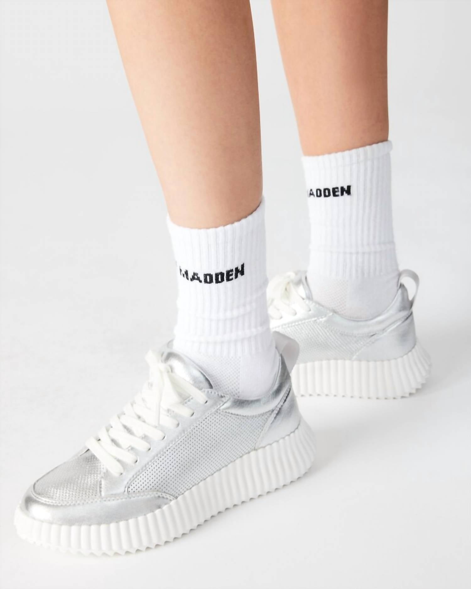 Get your daily steps in with these adorable sneakers. Unleash your style with the Women's Shock Jogger Sneakers by STEVE MADDEN in an eye-catching silver hue. Crafted with a leather upper and featuring a micro suede lining, these sneakers offer a perfect blend of style and comfort. The design is highlighted by a chunky, 1.25-inch platform sole with bubbled ribbing texture and perforated upper panel details. Imported.