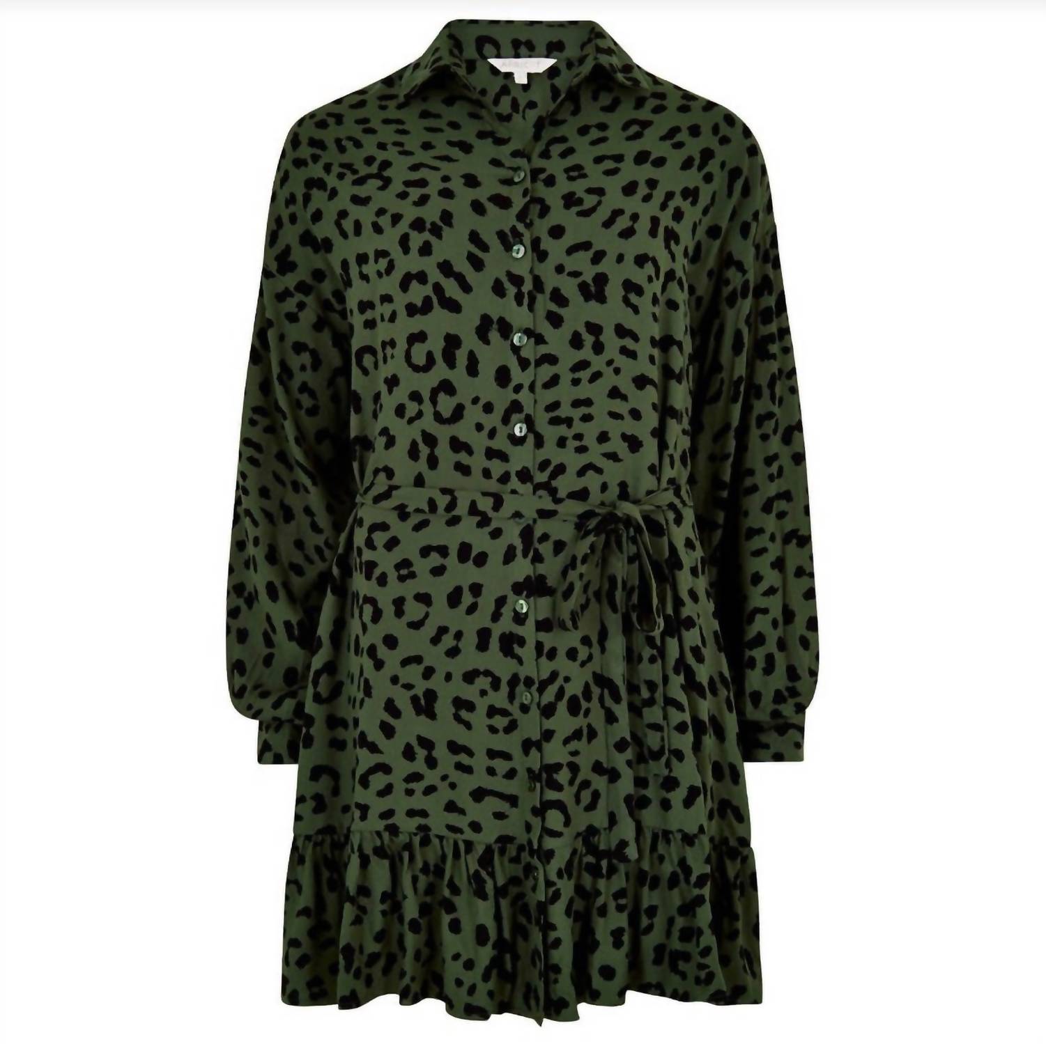 Step into chic elegance with the Leopard Ruffle Hem Belted Waist Shirt Dress by APRICOT, a stylish piece in a captivating olive tone. This patterned dress features long sleeves, a classic collar, and a flattering shirt silhouette. It is designed with a button closure, effortlessly merging comfort with sophisticated boho chic style. Perfect for a dinner party or celebrating New Year's Eve, this dress is a staple for your spring wardrobe.