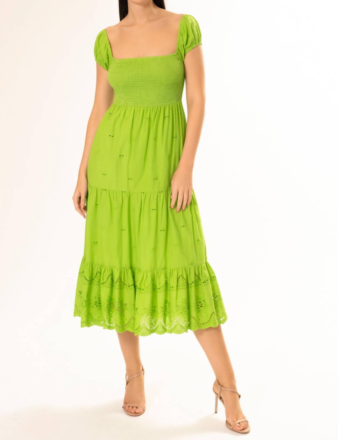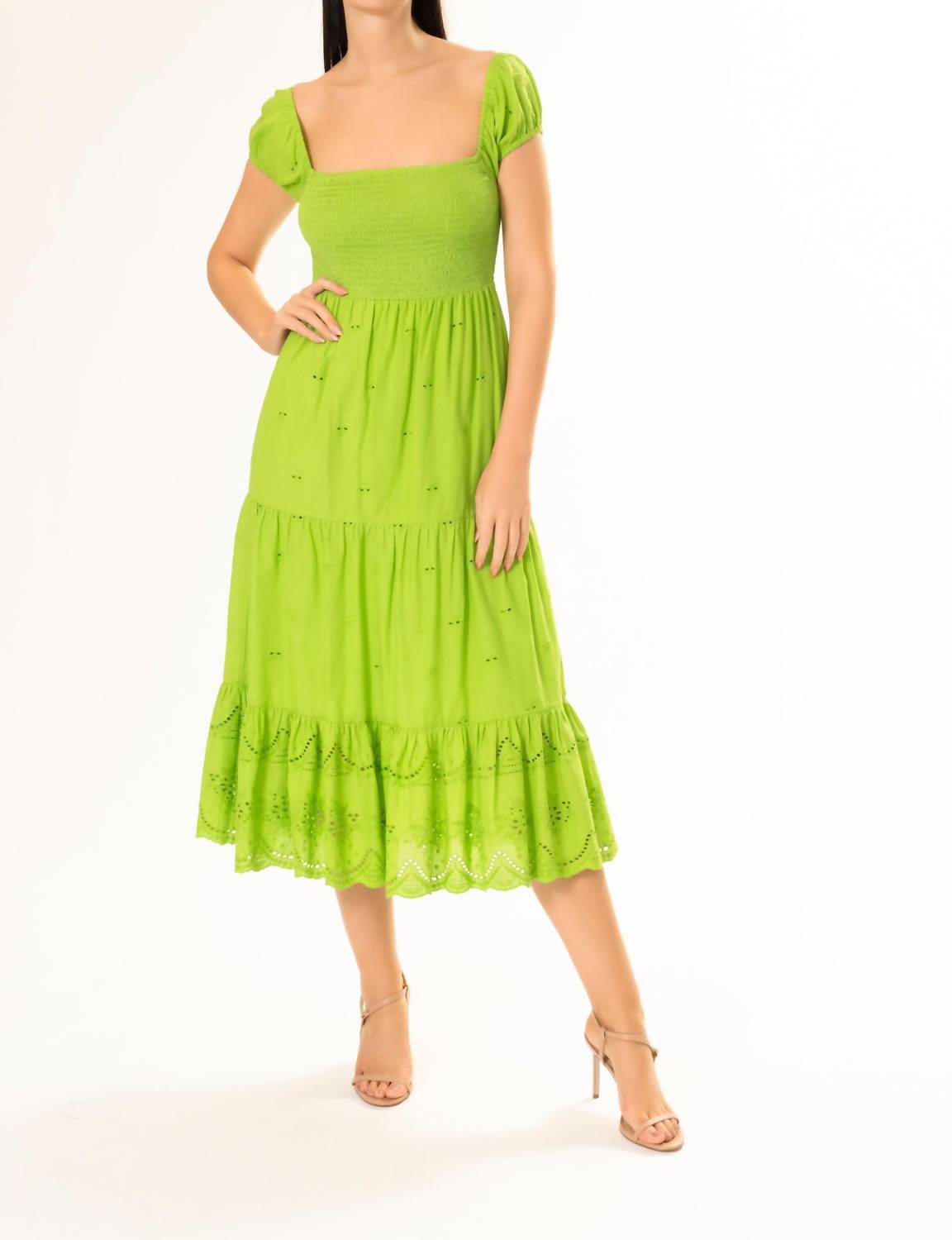 Discover the Martina Midi Dress by Area Stars, a stunning piece in elegant green perfect for summer soirées. This A-line dress features a flattering cap sleeve and a square neckline complemented by a tiered skirt with delicate eyelet detailing for added texture. Crafted with a solid pattern, it seamlessly combines modern elegance with timeless charm, ideal for both casual outings and evening events. Care instructions: Machine wash.