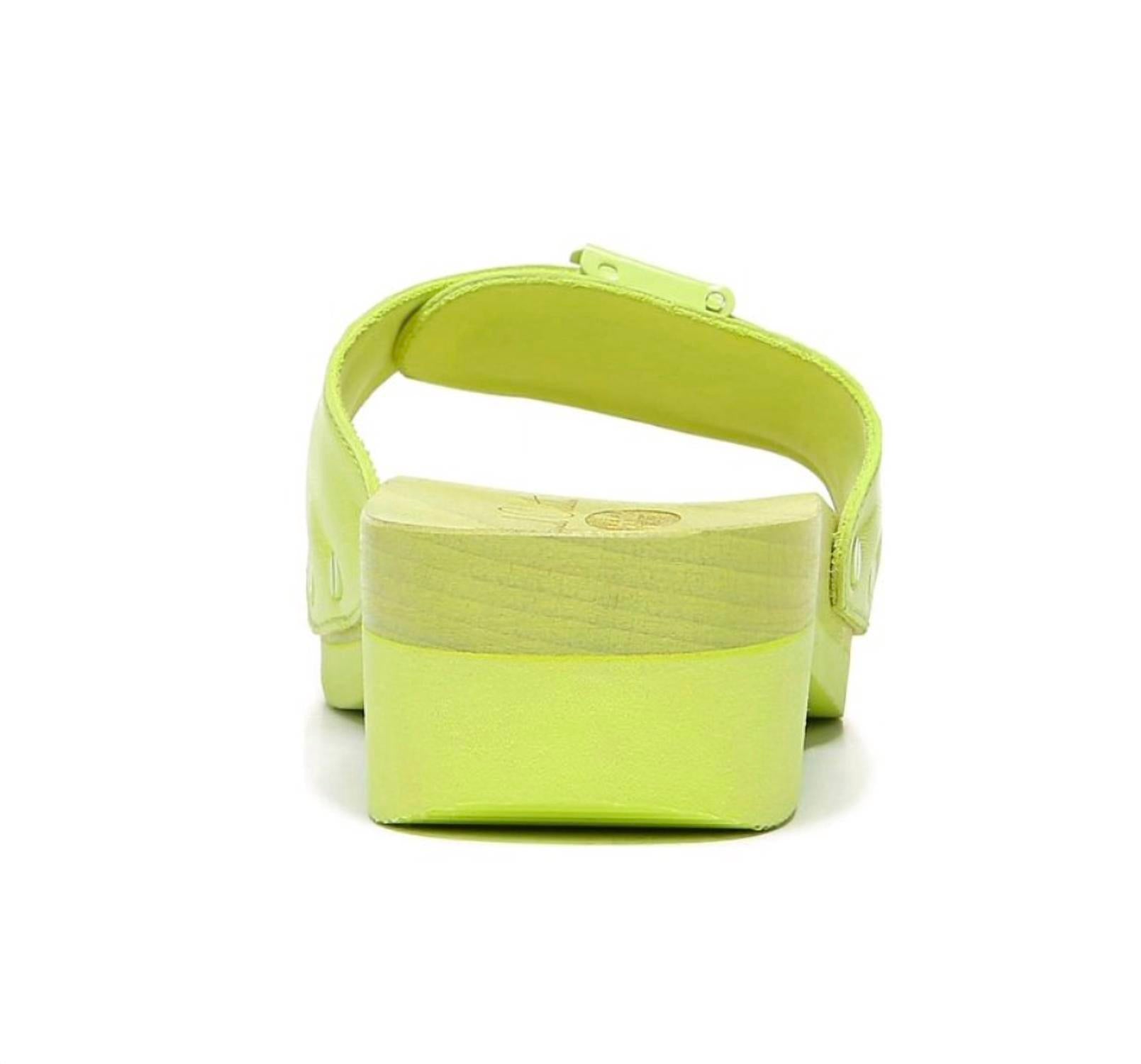 Step into sustainable style with Dr. Scholl's Women's Originally Slip On Open Toe Block Heel Sandals in vibrant Sunny Lime. Crafted from responsibly sourced suede, these sandals feature a handmade artisanal wood sole from natural beechwood and a chrome-free upper, certified by the Leather Working Group. With a slip-on fit and iconic adjustable metallic buckle, these sandals offer lightweight, flexible movement and a contoured footbed for unparalleled support and comfort. Perfect for summer vacations, these shoes come with a durable rubber outsole and a chic open-toe design.