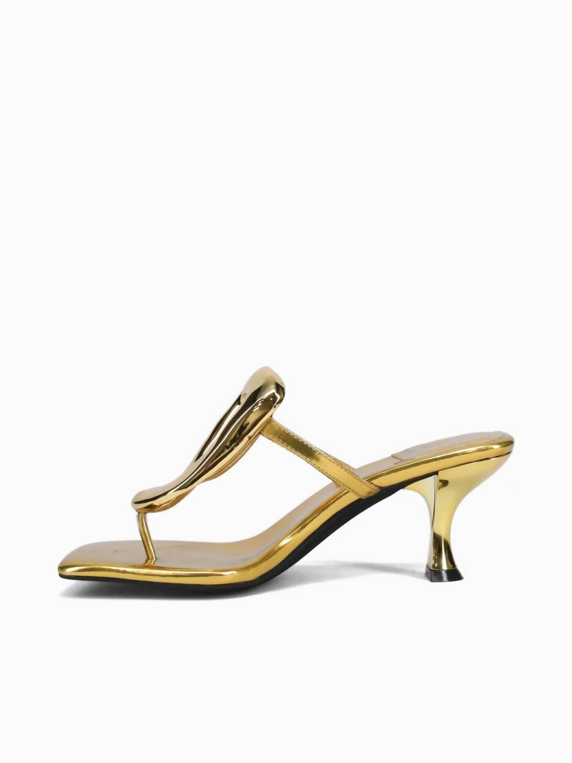 Flowy dresses, cropped pants, and even jumpsuits... this sandal works with them all! Step into elegance with the Women's Ornament Thong Sandal by Jeffrey Campbell, perfect for evening events and showcasing a sense of quiet luxury. Featuring a striking gold metallic finish, this sandal is designed with an open toe and a trendy 3" kitten heel, elevating your summer wardrobe. The sandal boasts a durable rubber sole for comfort and lasting wear. Embrace the effortless style and sophistication of these sandals, ideally suited for the fashionable adult woman.