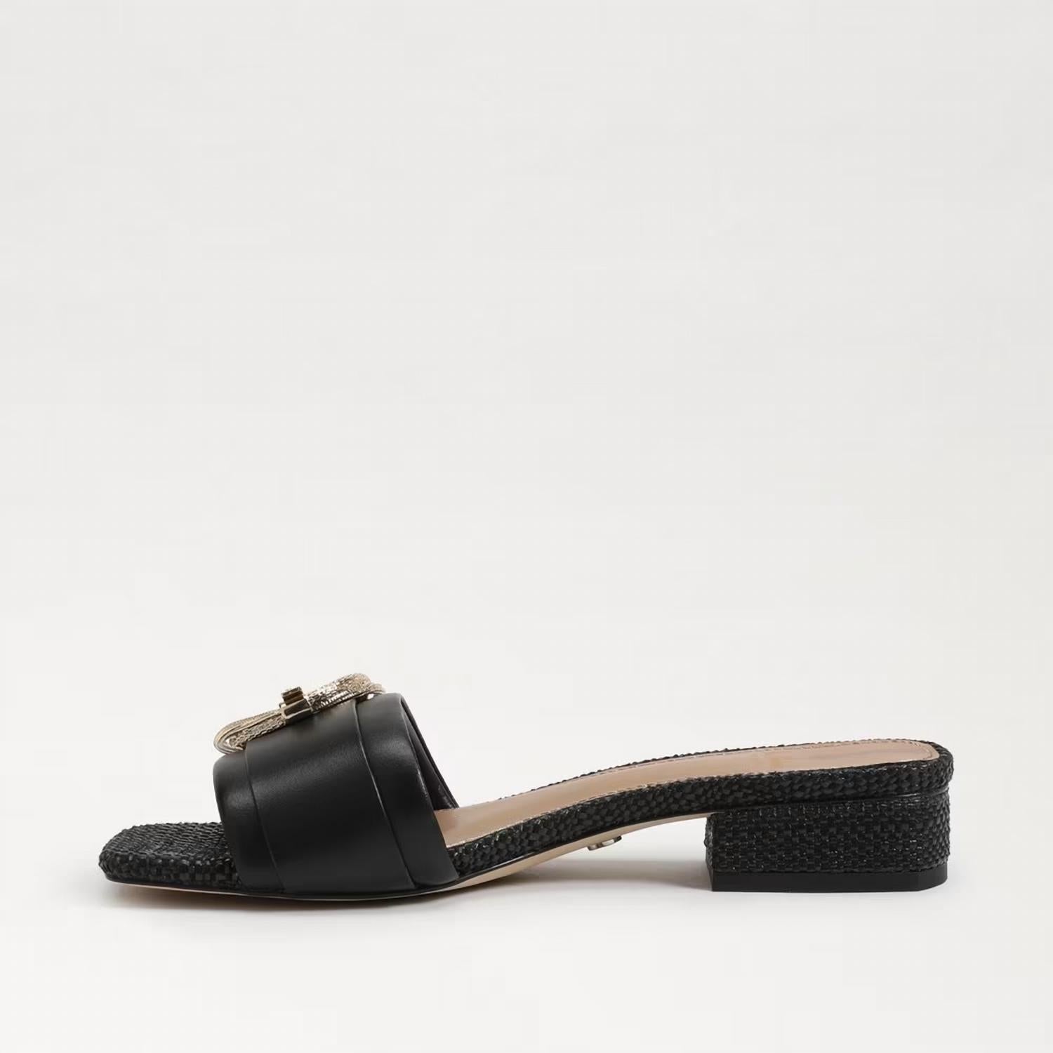 Step into elegance with the Women's Delfi Slip-On Open Squared Toe Block Heel Fashion Slide Sandal by Sam Edelman, where sharp edges meet sophisticated rounded curves. Crafted from luxurious leather, these sandals feature a stylish open toe and a distinctive double circle buckle, all set on a comfortable 1-inch block heel. The slip-on design ensures easy wear, while the synthetic insole promises comfort for a night out. Perfect for fall occasions, like a dinner party or Thanksgiving celebration.
