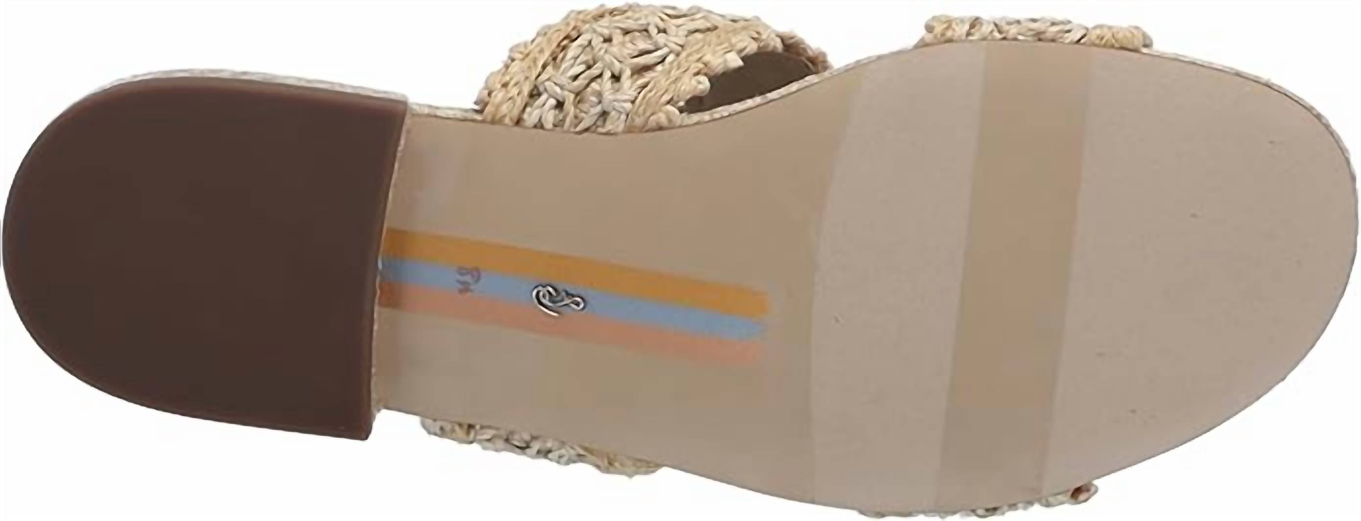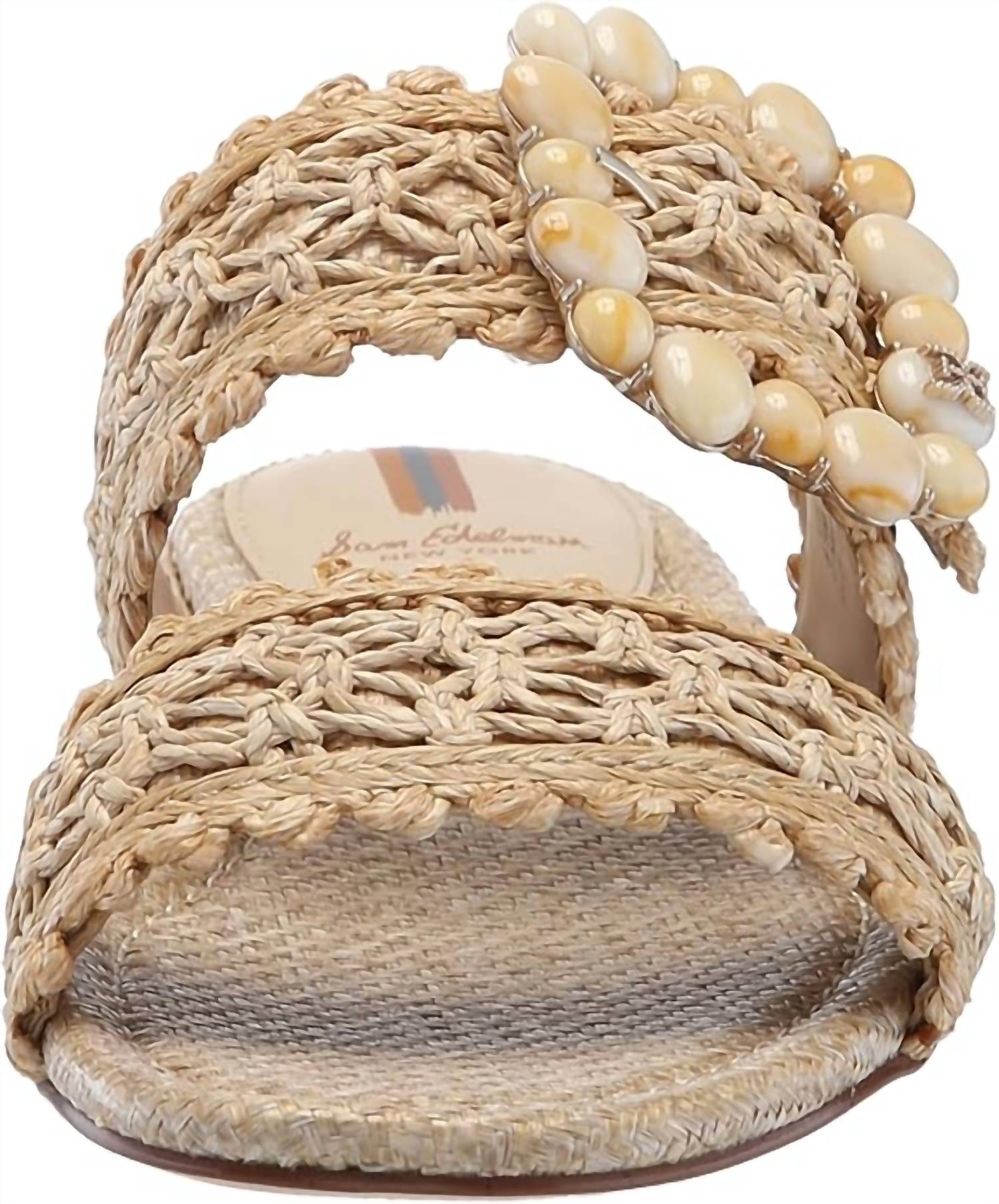 Flowy dresses, cropped pants, and even jumpsuits... this sandal works with them all! Slip into the Sam Edelman Women's Elisa Slide Sandal for effortless summer style in Natural Raffia. With a chic open toe and subtle .62-inch heel, these slides feature a unique cabochon frame buckle and scalloped trim detailing. Crafted from fabric with a synthetic insole for comfort, they are designed with a slip-on closure for easy wear. Perfect for a travel-ready, boho-chic look that pairs beautifully with summer neutrals.