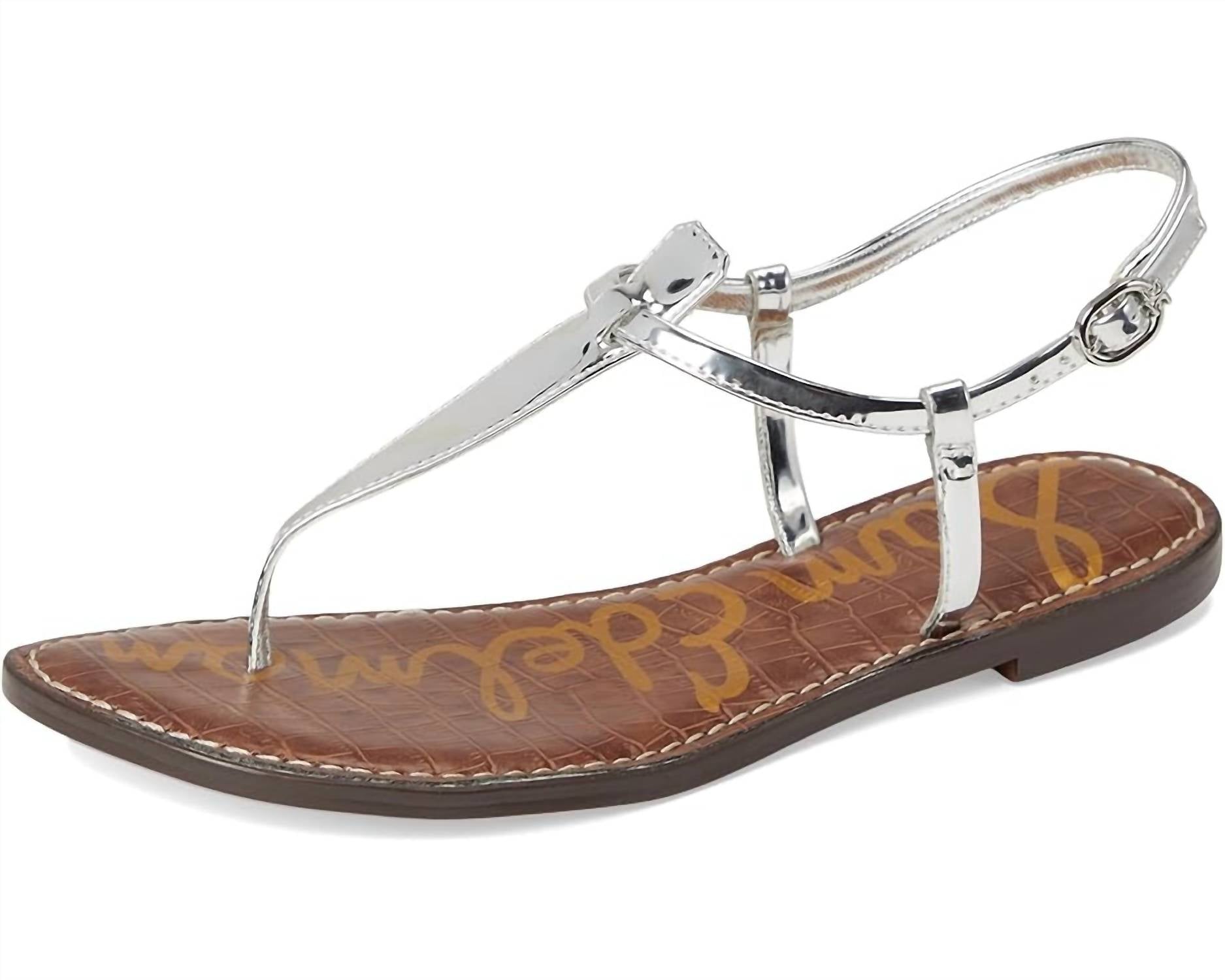 This sandal will take you from brunch to dinner and everything in between. Experience effortless elegance with the Women's Gigi Thong Sandal by Sam Edelman, a spring essential in soft silver faux leather. This minimalist sandal boasts an open-toe design with an adjustable buckle closure on the ankle strap, providing a secure yet stylish fit. Made from premium leather, its signature padded sock ensures all-day comfort, perfect for pairing with anything from crisp white jeans to flowy sundresses. Heel height is a subtle 0.62" and is true to size, making it ideal for a relaxed vacation or Mother's Day outing.