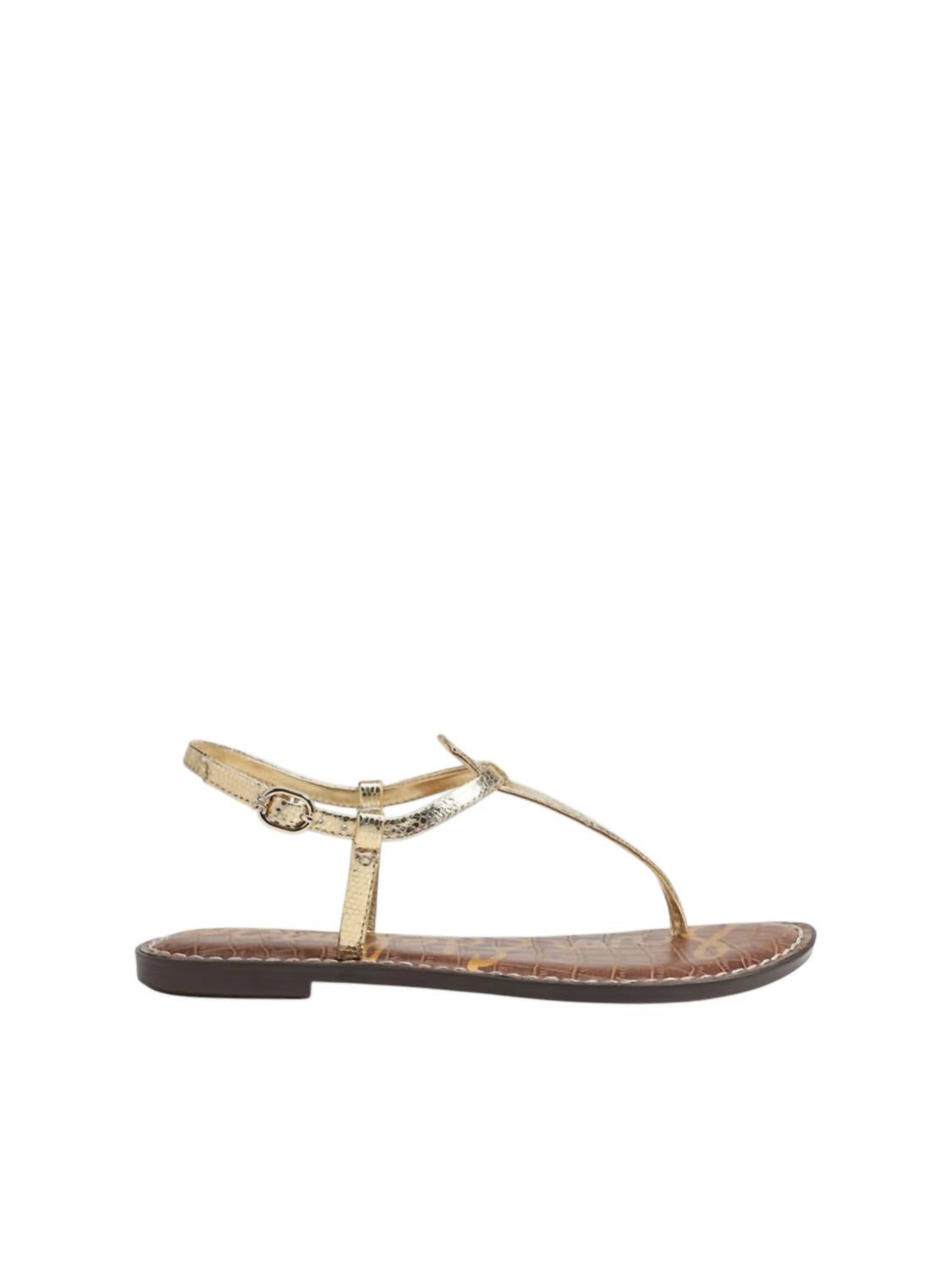 Flowy dresses, cropped pants, and even jumpsuits... this sandal works with them all! Step into effortless elegance with the Women's Gigi Thong Sandal by Sam Edelman, a quintessential choice for sunny days. Crafted from luxurious leather in a chic Amber Gold Metallic finish, this sandal features an adjustable buckle closure for a secure fit. Its open-toe design includes a croco-embossed insole made from synthetic material, topped with a comfortable, padded sock. Designed with a flat heel of 0.62 inches, this versatile sandal is perfect for a minimalist and vacation-ready look.