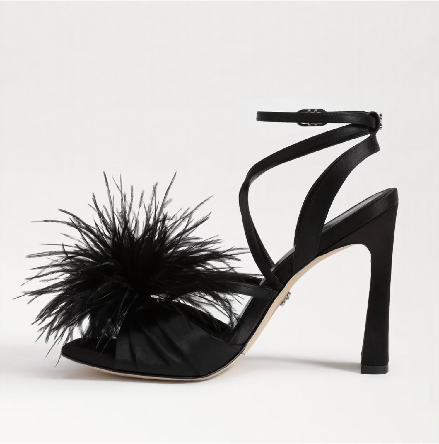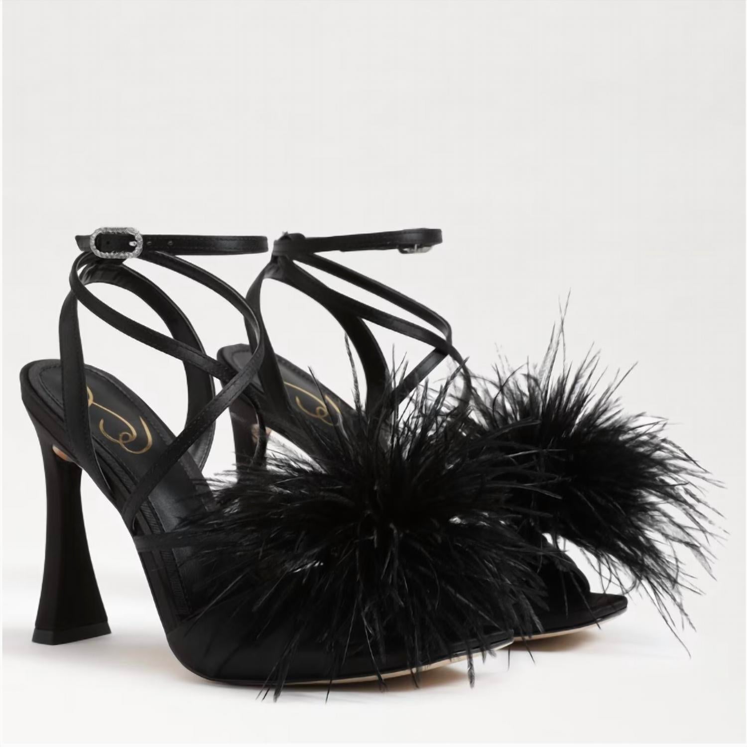 Don't be deceived, these heels are comfy as can be. Elevate your style with the Women's Layton Ankle Strap Sandals by Sam Edelman, a striking choice for any occasion. Designed in a black satin finish, these sandals feature a 3.9-inch spool heel and an open toe for sleek sophistication. They boast a fabric & other material construction with a synthetic insole, and a buckle closure ensures a secure fit. Perfect for fall dinner parties and Thanksgiving celebrations, these feather-detailed sandals are a must-have addition to your collection.