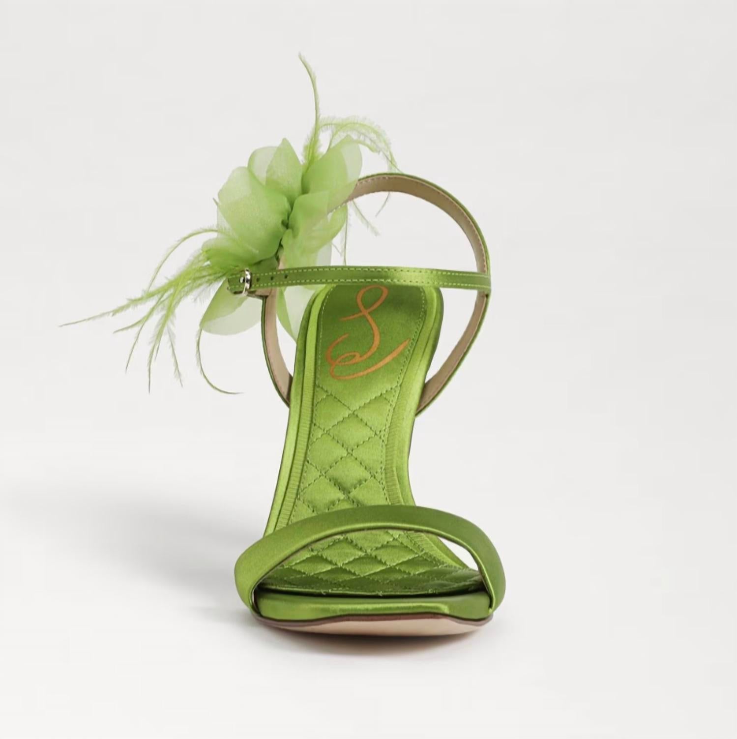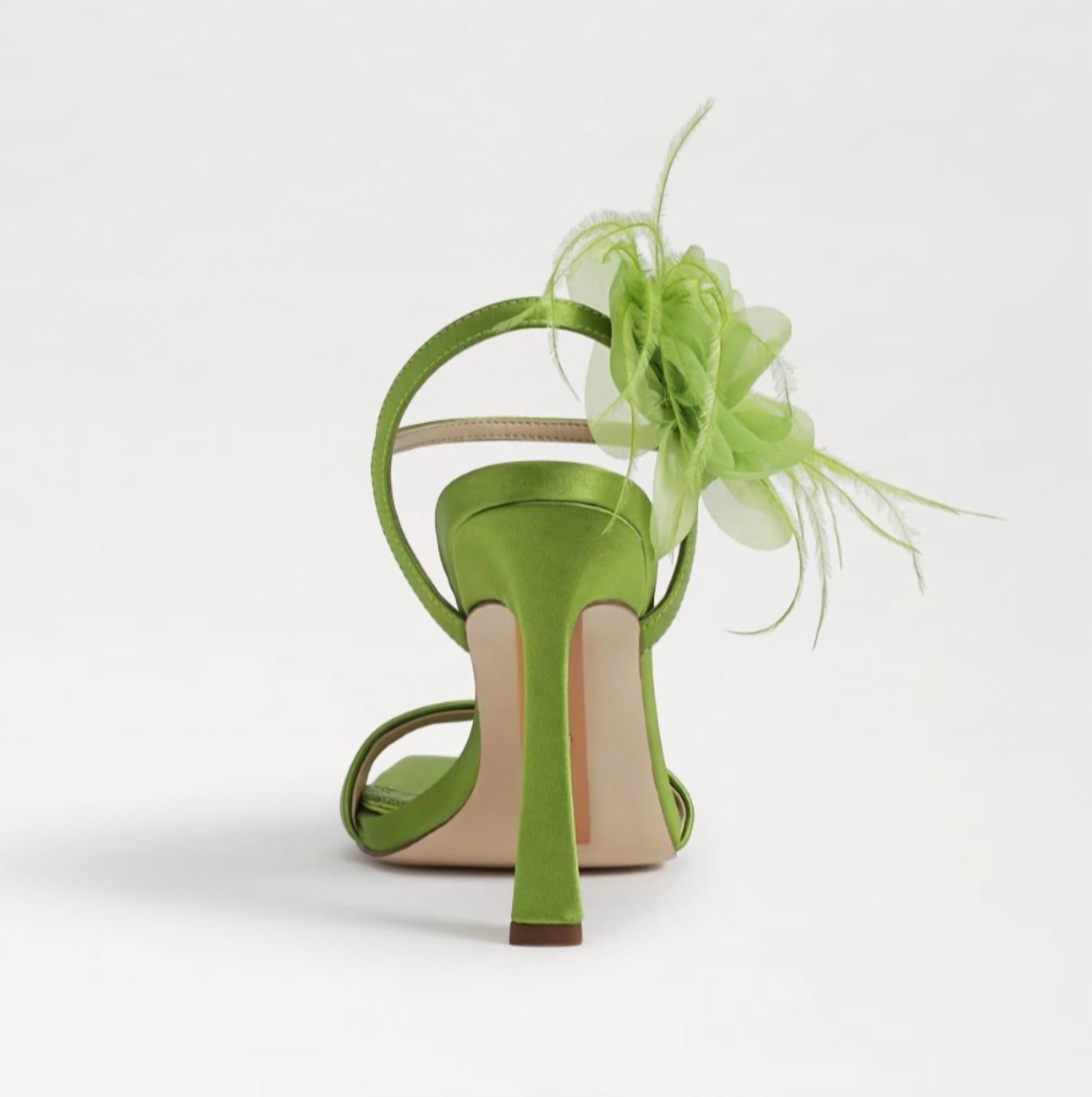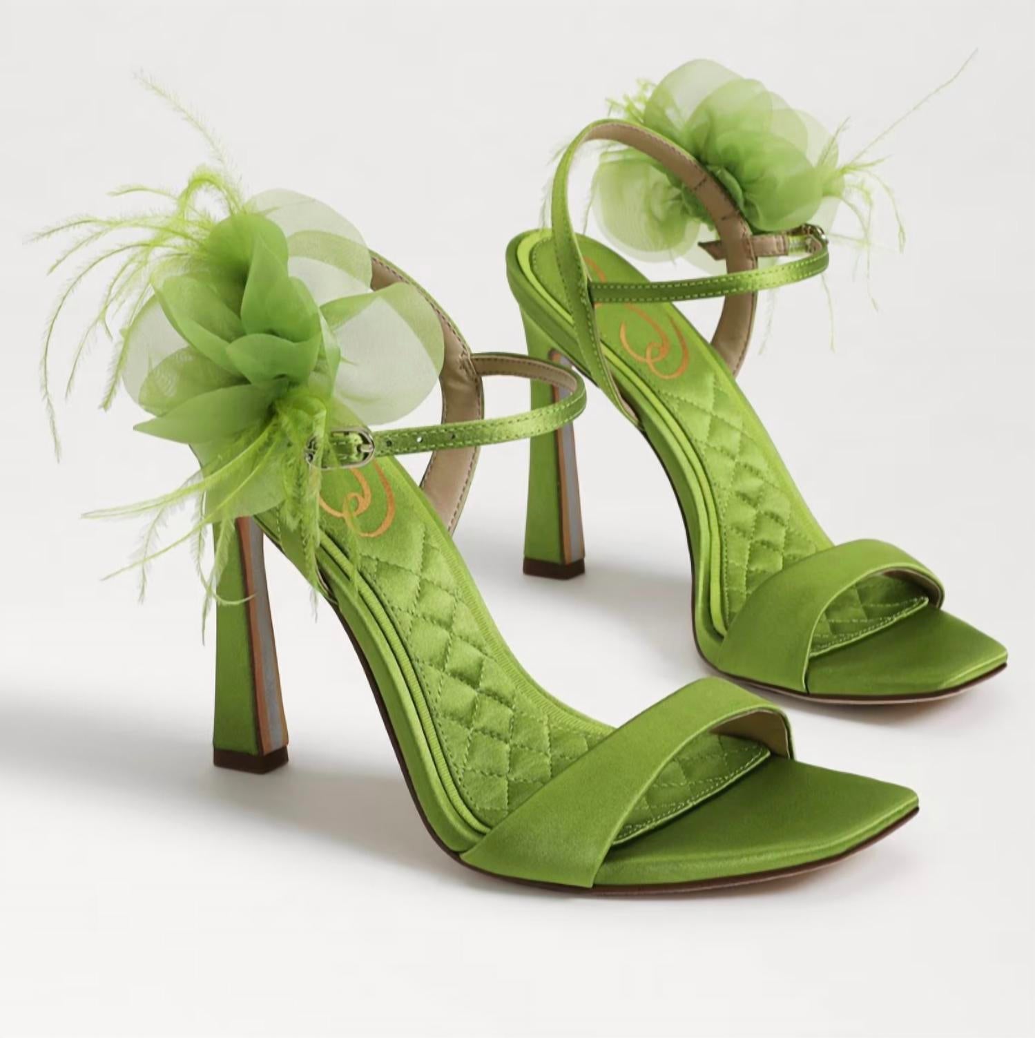 Pair these beauties with your favorite skinny jeans or dress for a night out on the town. Step into elegance with the Women's Leana Suede Squared Open Toe Stiletto Heeled Sandals by Sam Edelman in vibrant Tropic Green. These sandals feature a sleek open toe design and a stylish 4-inch stiletto heel, offering a polished look perfect for holiday parties and Thanksgiving gatherings. Expertly crafted with suede and detailed with a charming corsage, this pair ensures you will take center stage. Secure them comfortably with the buckle closure, enhancing your every step with feminine sophistication.