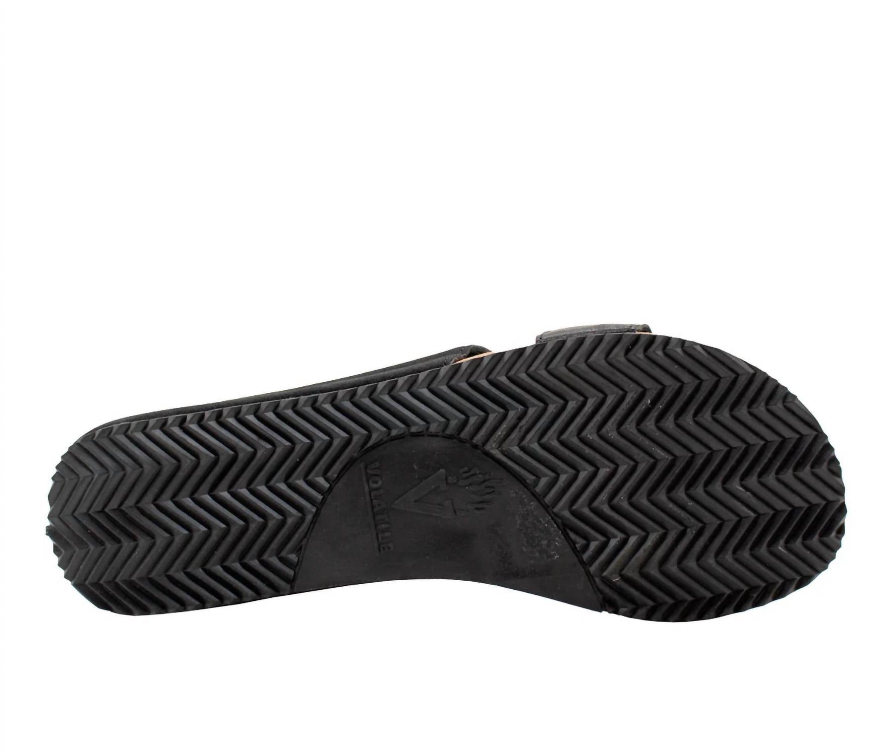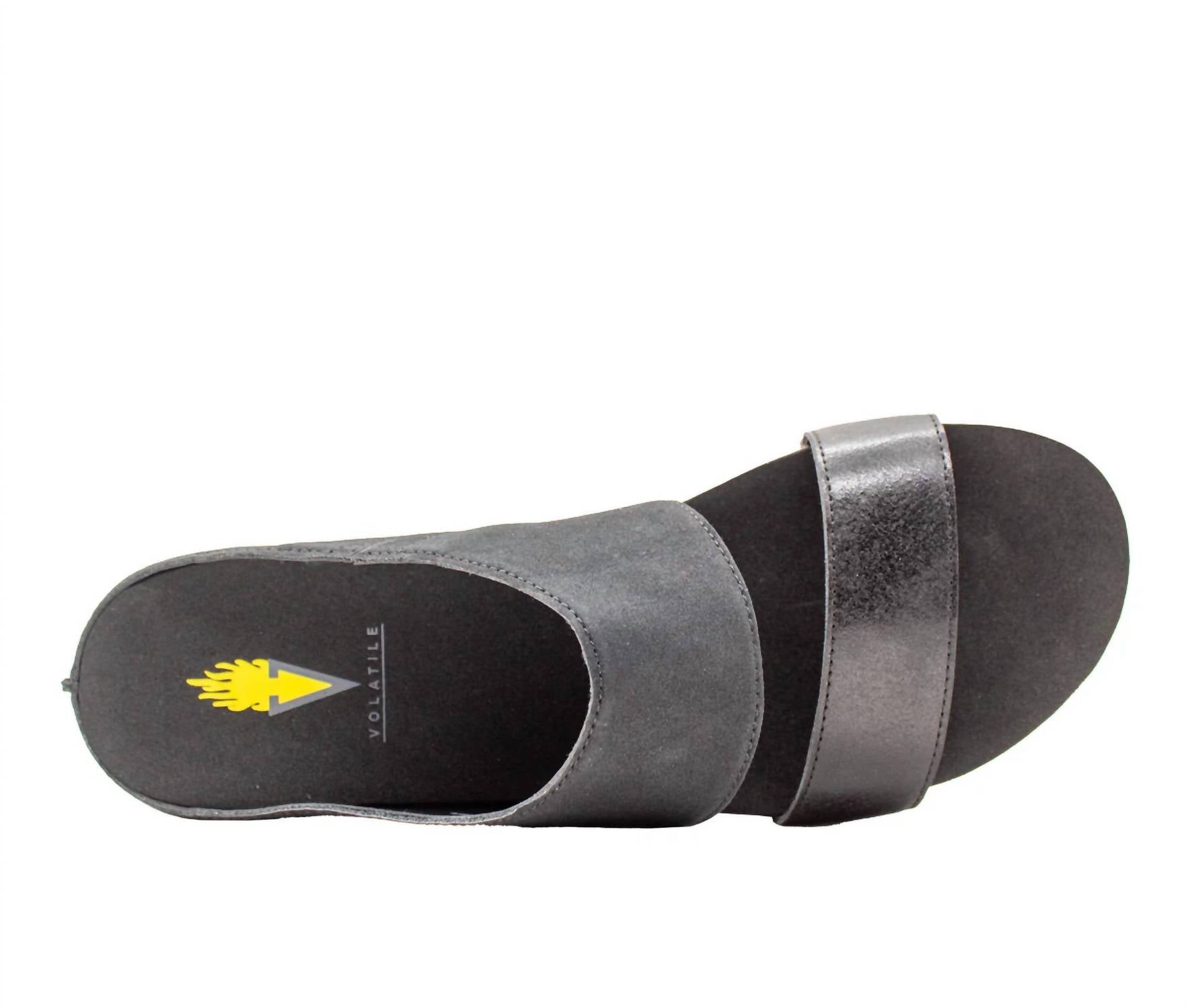 Classicly cute and all-day-wearable. We love this sandal. Step into summer style with Very Volatile's Women's Campfire Metallic Slide Sandals in striking black. These sandals boast a faux leather upper with a metallic strap and inside elastic gore for a snug fit, complemented by a synthetic lining and padded insole for ultimate comfort. Featuring a cork 1.25-inch wedge heel with a rubber traction outsole, they’re perfect for any sunny occasion, from beach days to casual outings.