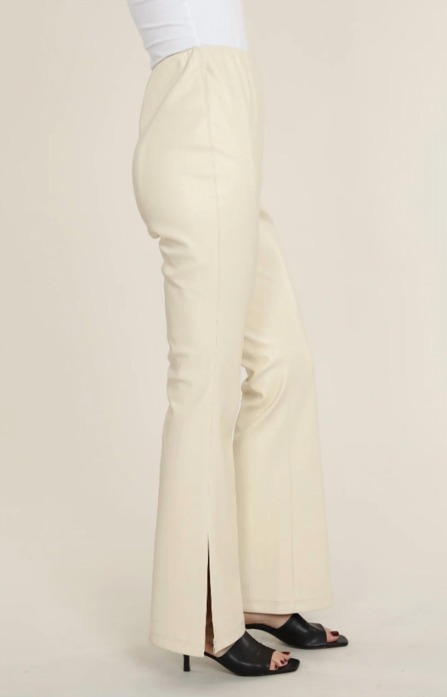 Crafted from metallic faux leather in a champagne hue. Flared design elongates the legs for a chic silhouette. Model is 5'9" wearing size S. True to size. Dry clean.