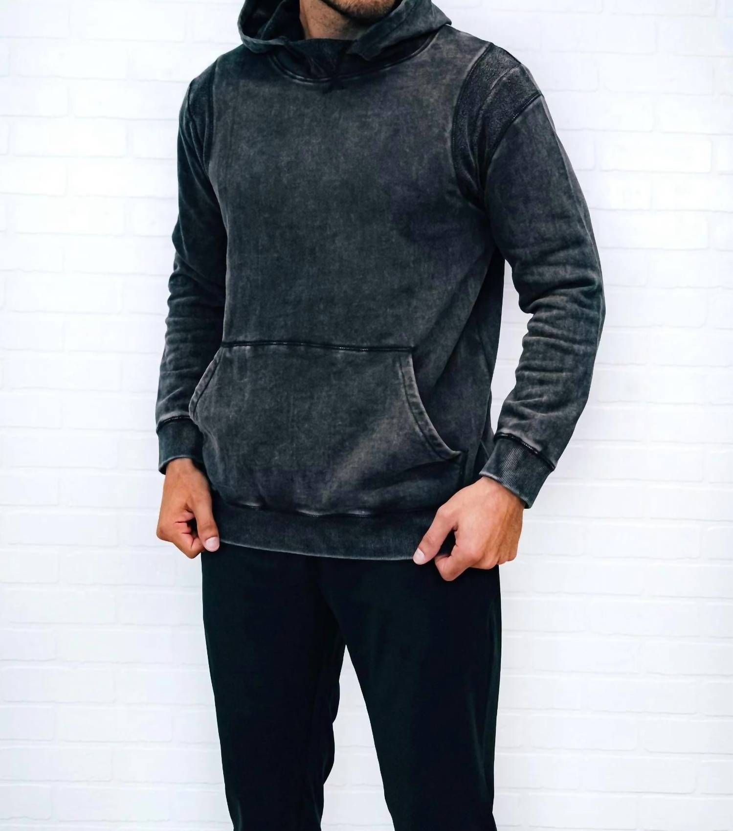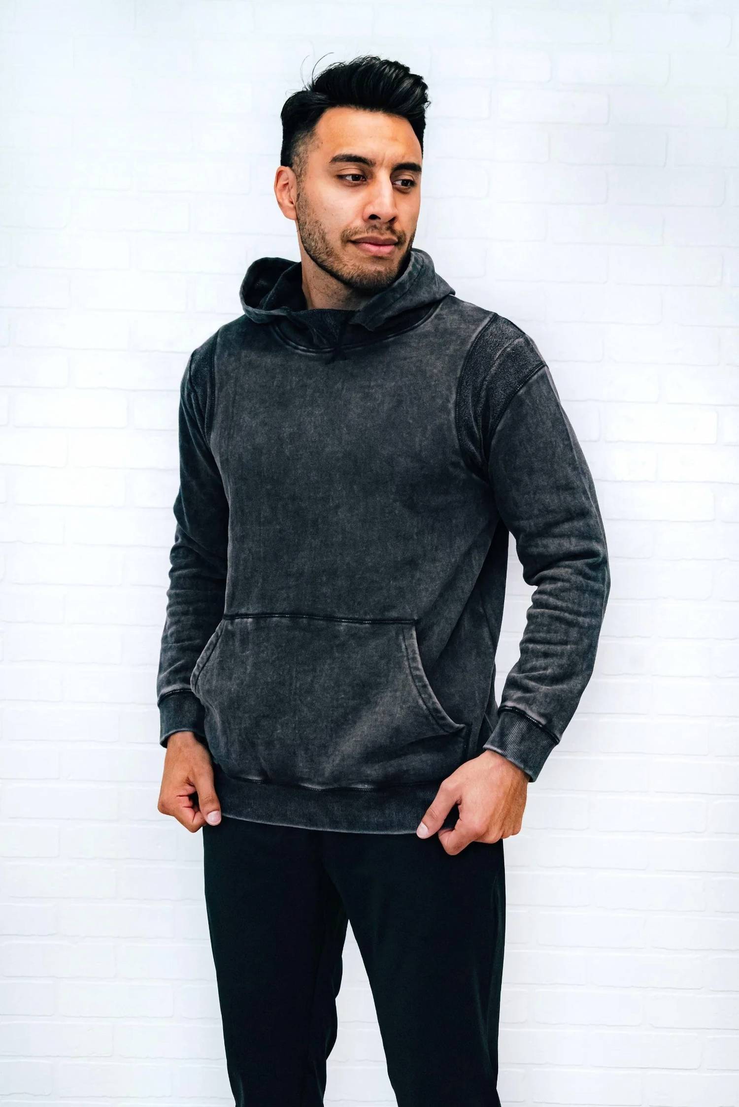 Streetwear-inspired essential in versatile black with a rugged, antiqued finish. Features long, dropped sleeves, a hooded crew neckline, and a convenient pullover closure. Crafted from 100% cotton fleece with a unique mineral wash, effortlessly combines style and comfort. Machine washable.