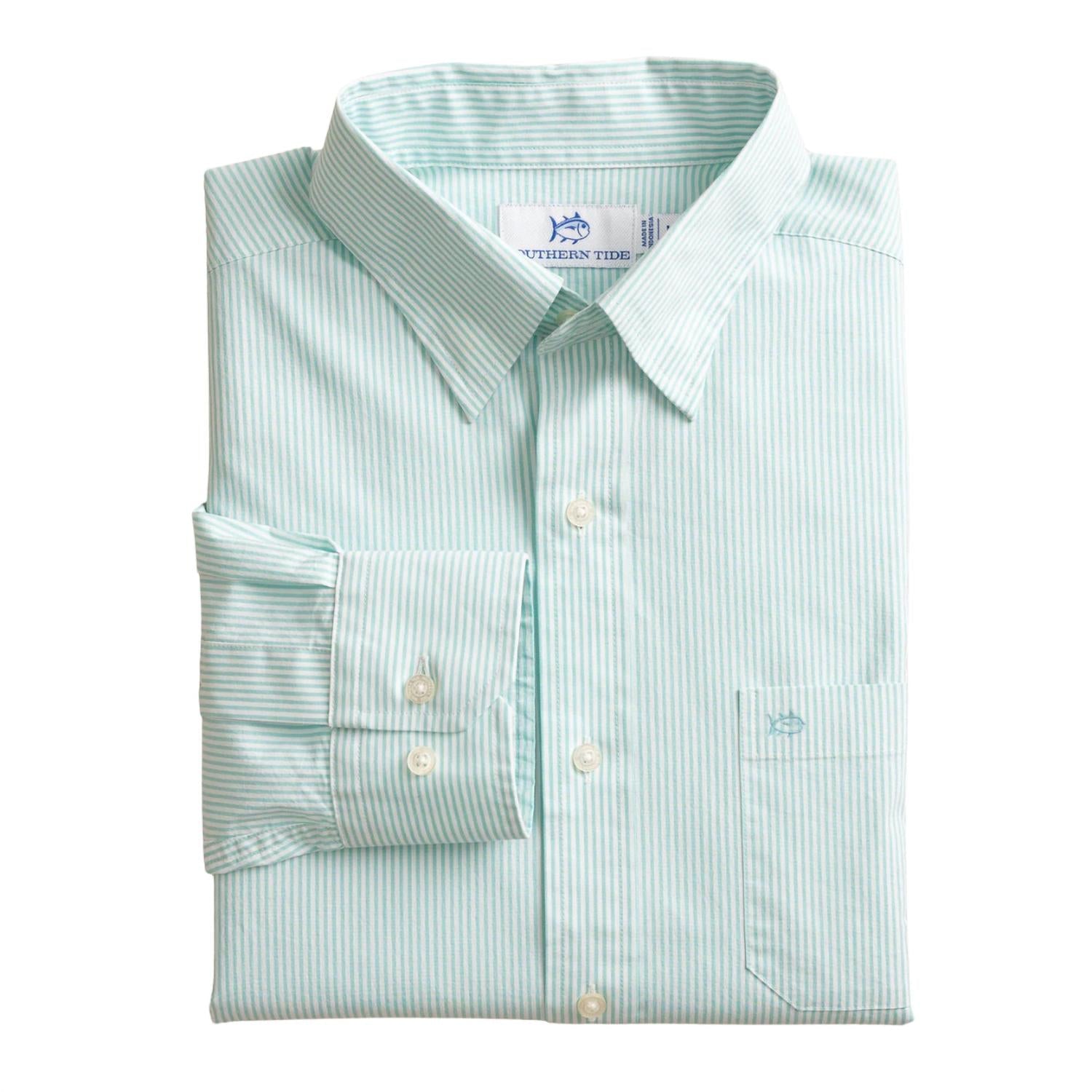 Introducing the Charleston Granby Stripe Long Sleeve Sport Shirt by Southern Tide, a classic addition to any preppy wardrobe. Designed with a long sleeve and created from a cotton blend, this shirt features a sophisticated blue and white pinstripe pattern. The button closure enhances the timeless look, while the pocket detail adds functionality. For convenient care, this sport shirt is machine washable and can be tumble dried, making it perfect for spring dinners and holiday gatherings.