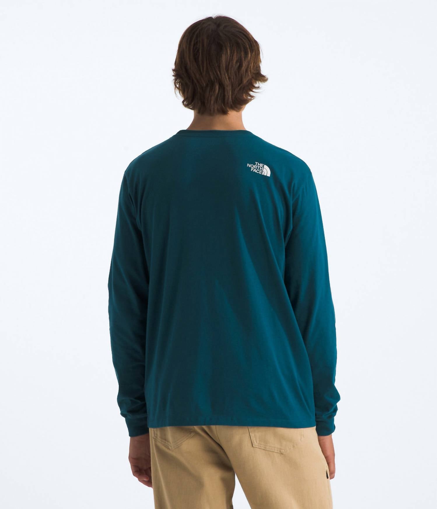 Introducing The North Face Varsity Long Sleeve Tee, crafted for comfort and style in Midnight Petrol. This tee boasts long sleeves with set-in design and ribbed crew neck and cuffs, enhancing its standard fit with no-hand, water-based screen-printed graphics adorning the chest and back-right shoulder. Made from climate-conscious cotton and recycled polyester, it's a responsible choice for your wardrobe. Closure: Pull on. Care: Machine wash, tumble dry. Imported.