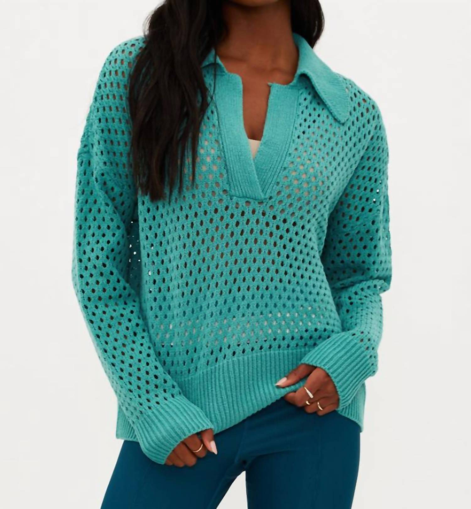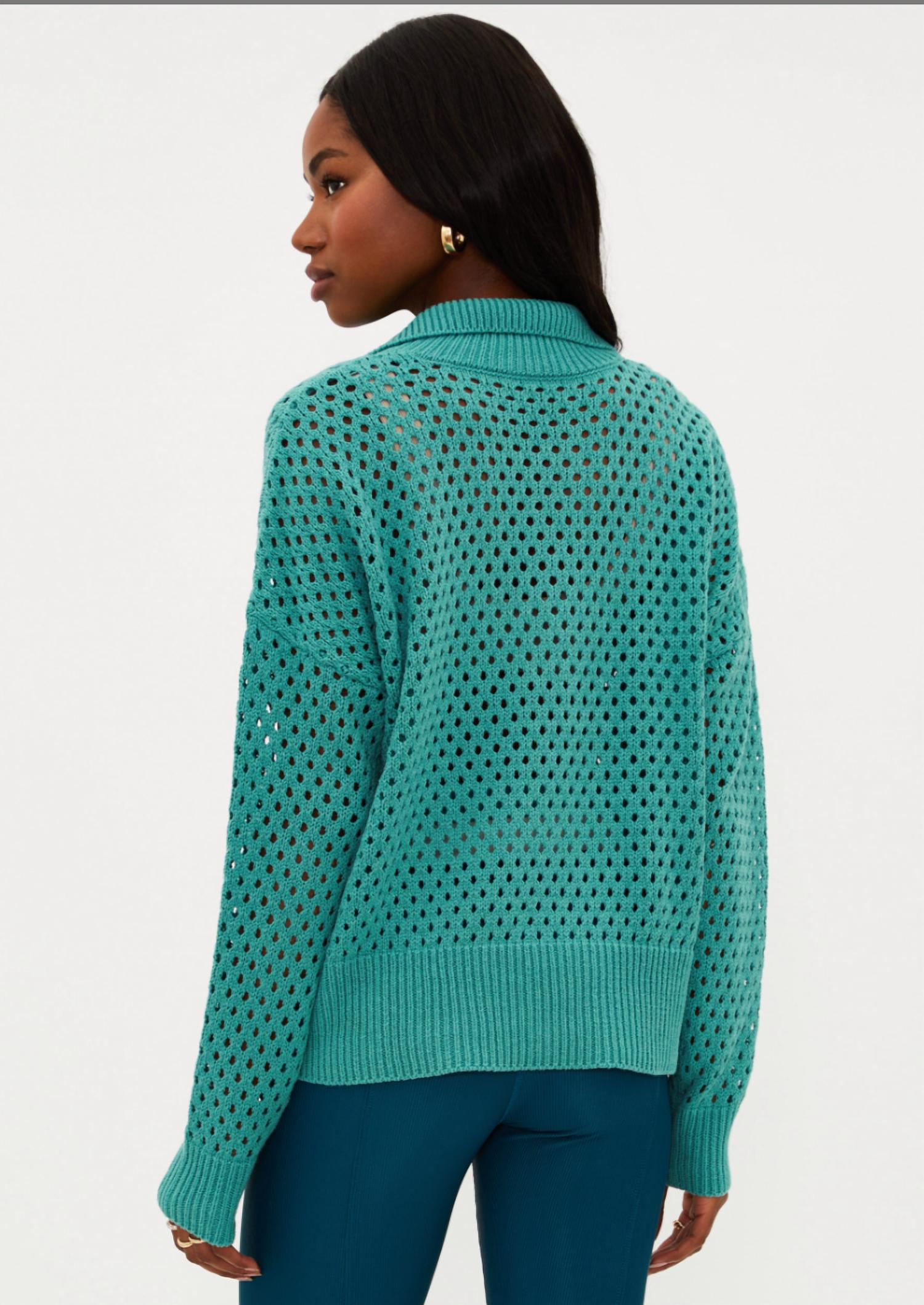 A long sleeve top you can wear with denim, skirts, well... just about anything! Unveil a blend of style and comfort with the Wynn Top by Beach Riot, crafted in a textured open-knit cotton and acrylic blend. Featuring long sleeves, a rib-knit spread collar, hem, and cuffs with dropped shoulders, this green polo top is an ideal transitional piece for the seasons. Composition: 60% Cotton, 40% Acrylic. Country of Origin: Not specified. Closure: Pull on. Care: Machine wash, line dry. Model is wearing size small.
