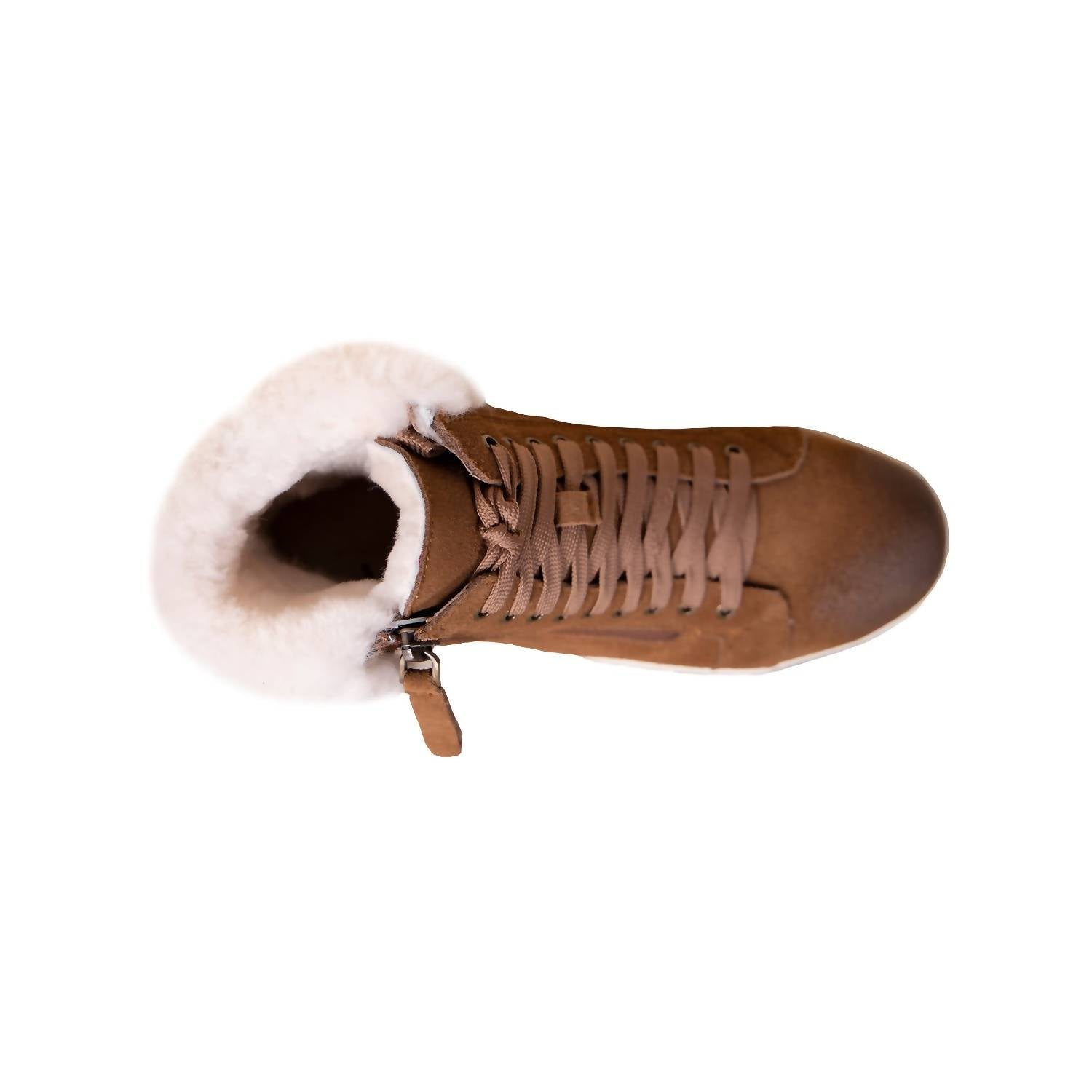 So versatile, you can wear these boots with your favorite jeans or even a dress for a more feminine feel.Important Note: Due to the sizing for this style running small—it is recommended that you order one size up. Model: CNS-151. Sheepskin and sneakers make a great combination—casual comfort and outstanding looks! Lining: 100% Sheepskin. Upper: Burnished suede leather, side zippered. Sole: Rubber