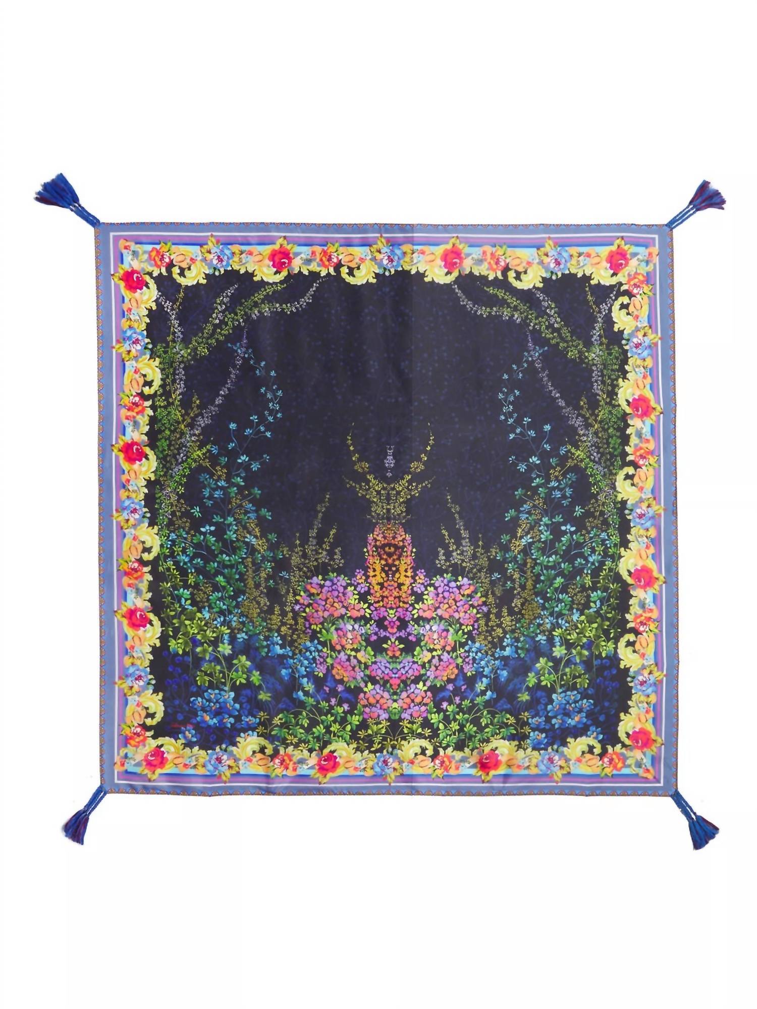 Magic Garden Silk Scarf is rich in color and pattern. Thoughtfully designed with an eye-catching pattern to enhance any look, this flowing scarf is finished at each corner with a decorative tassel for added texture. 100% Silk. Measurements: 44" x 44". Turn inside out and hand wash gently. Lay flat to dry. Light steam iron if necessary. Style C91624-E.