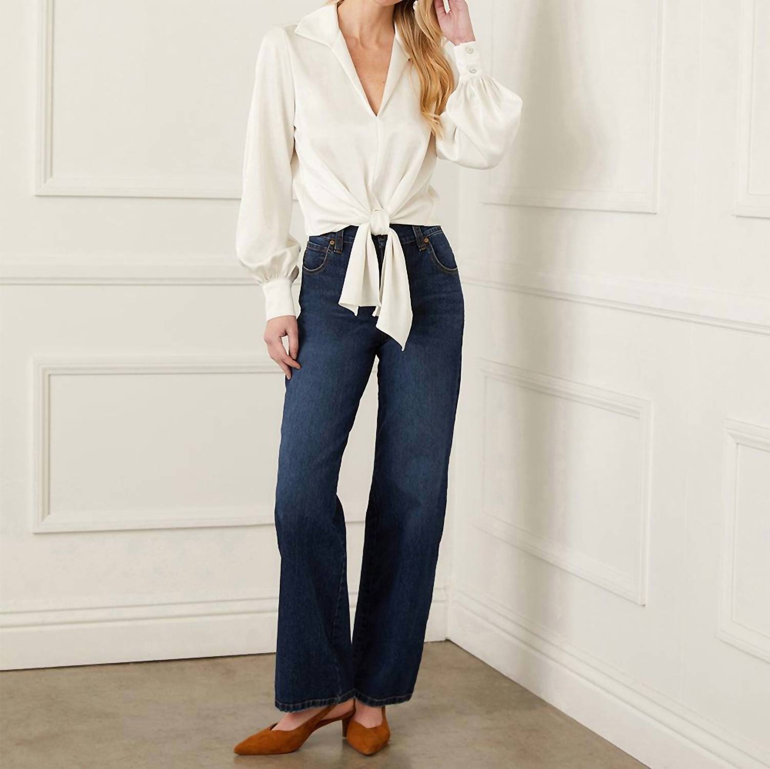 A timeless blouse that will never go out of style. Introducing the Karen Kane Satin Tie Front Top in elegant cream, a sophisticated addition to your wardrobe for both office elegance and evening allure. Crafted from 55% recycled satin polyester, this imported blouse features long blouson sleeves with pleated cuffs for a touch of drama. With a pull-on closure and a collared neckline, it measures 21 1/4 inches in length for a flattering fit. To maintain its luxurious quality, hand wash cold separately and hang to dry or opt for dry cleaning.