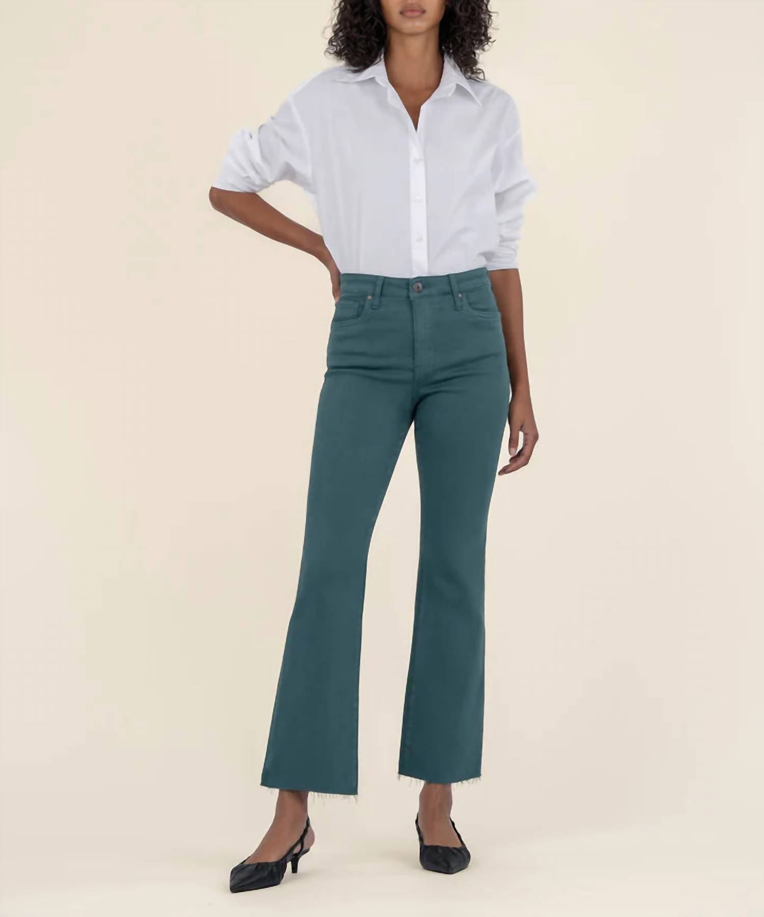 Elevate your denim collection with the Kelsey High Rise Gab Ab Jeans by KUT FROM THE KLOTH in striking teal. These jeans feature a high-rise design and a classic fit that flares at the ankle with an inseam of 27.75 inches, creating a trendy silhouette with a 10.25-inch rise and 17.75-inch leg opening. Made from 98% cotton and 2% spandex, they offer a soft, low-stretch fabric for comfort and fab ab front pockets that ensure a smooth look. Closure: Button closure. Care Instructions: Machine wash and lay flat to dry.