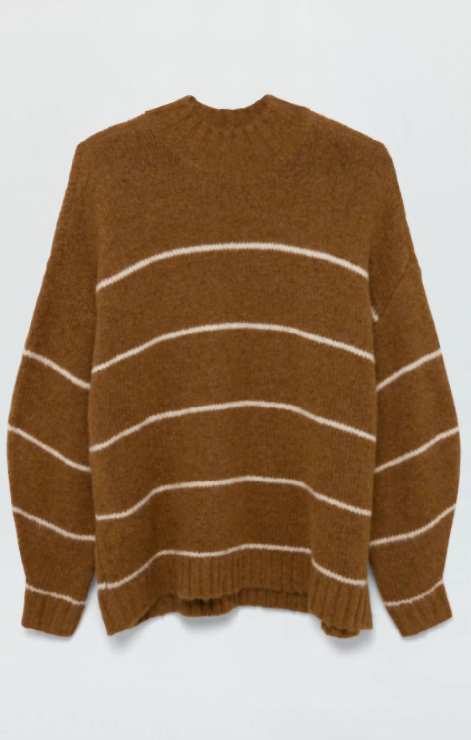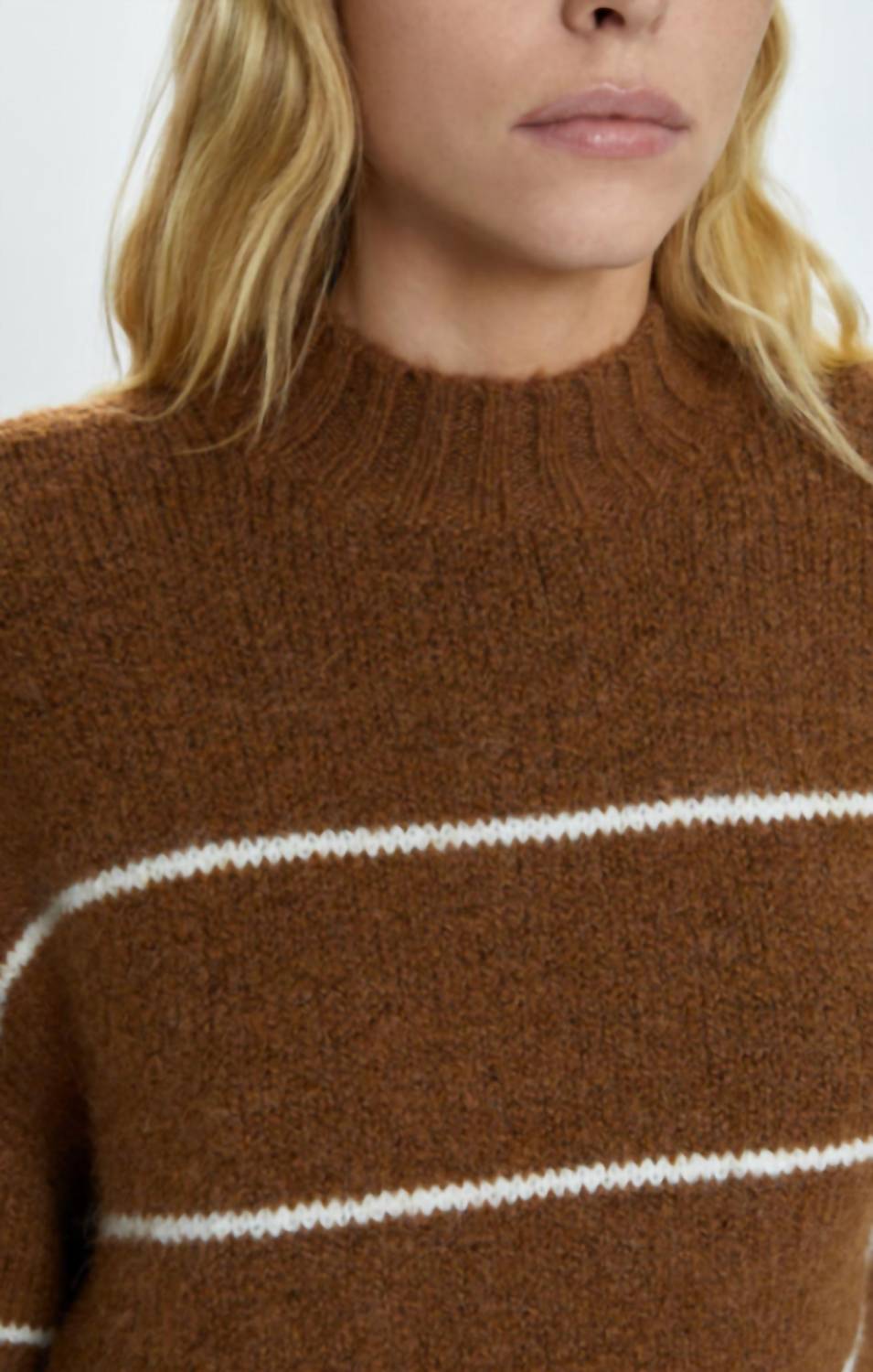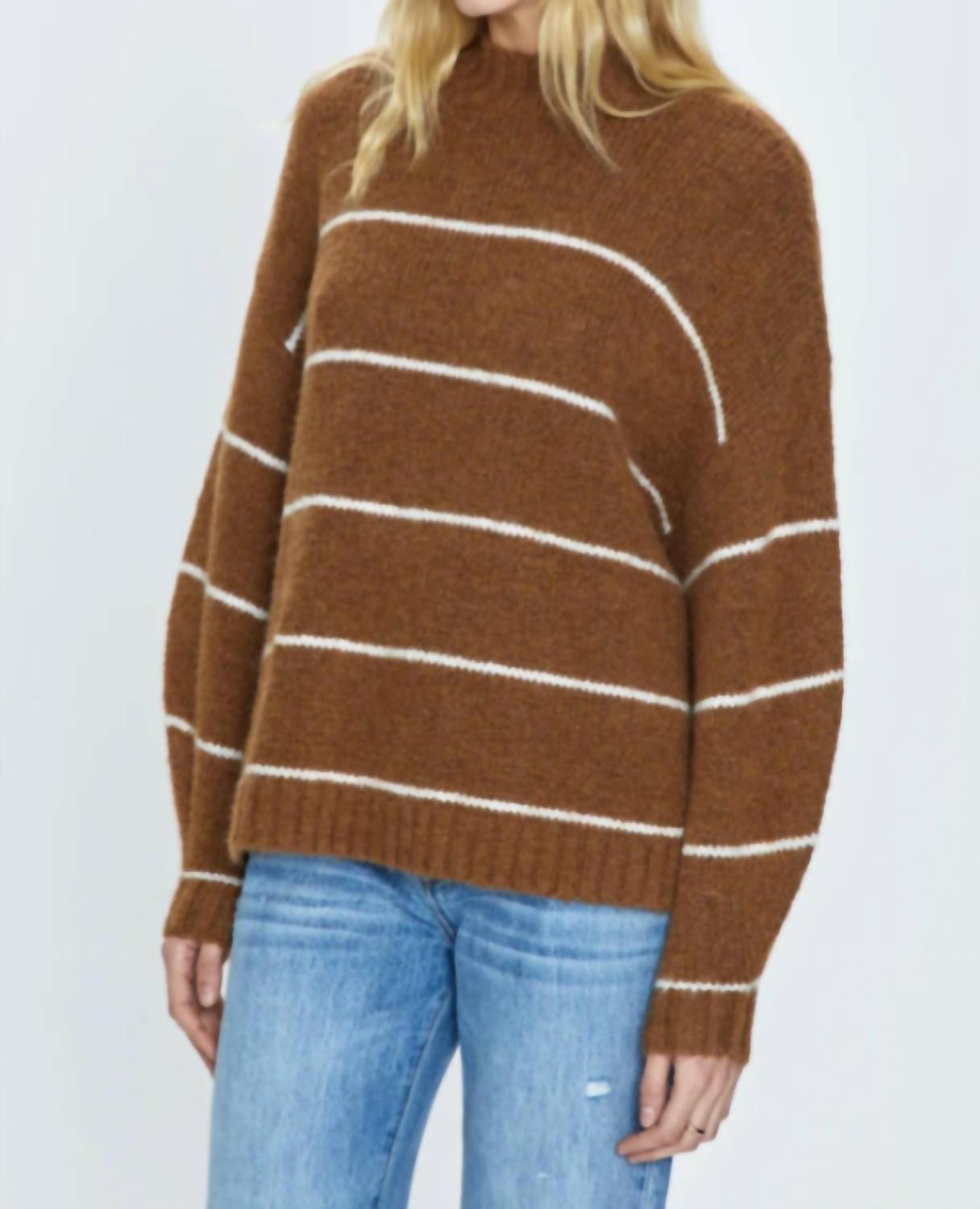 Layer under your favorite sweater or wear tucked into jeans for a perfectly polished winter look. Embrace cozy sophistication with the Carlen Mock Neck Sweater by PISTOLA, a must-have for your fall wardrobe in a chic camel hue. This oversized, striped pullover features long sleeves, ribbed cuffs, and a mockneck collar, ensuring both style and comfort for any travel occasion. Crafted from a luxurious blend of 64% Acrylic, 13% Polyester, 9% Nylon, 8% Alpaca, 4% Wool, and 2% Spandex, it offers a midweight feel perfect for layering. Care: Hand wash cold. Model is 5'9" and wears a size small.