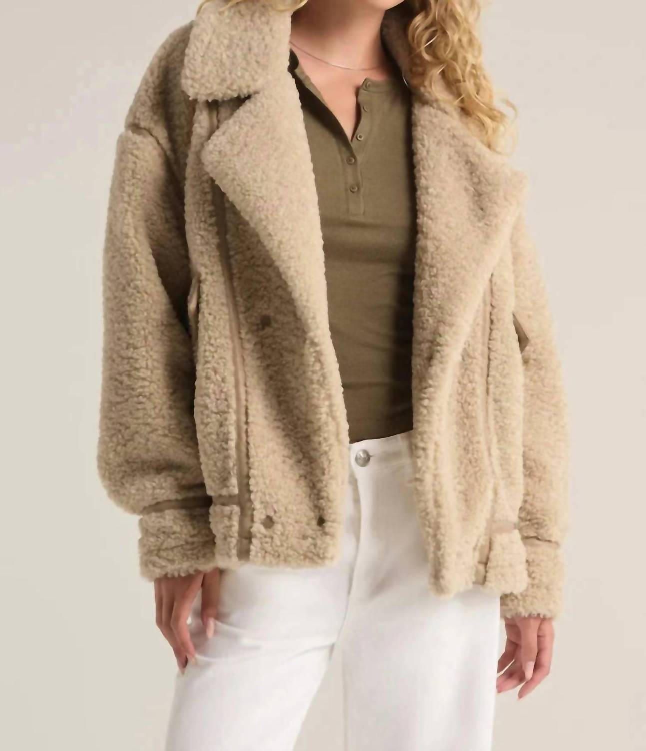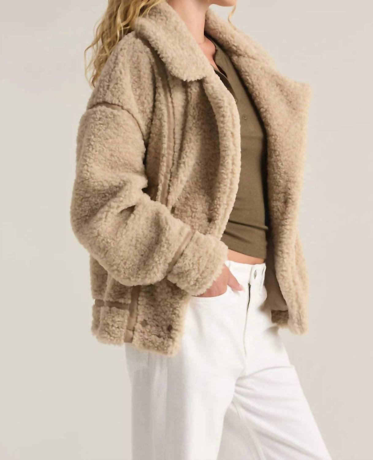 Downright adorable and so comfortable you won't want to take it off. This teddy jacket is a fan favorite. Embrace the cozy-chic aesthetic with the Ari Sherpa Jacket by Z Supply, designed in an elegant Fossil hue. This textured teddy jacket boasts long sleeves and is crafted from luxurious polyester with faux leather trim details. Its collared neckline, pockets, and classic button closure offer both functionality and style. Care instructions include hand wash and laying flat to dry, ensuring its plush quality is preserved.