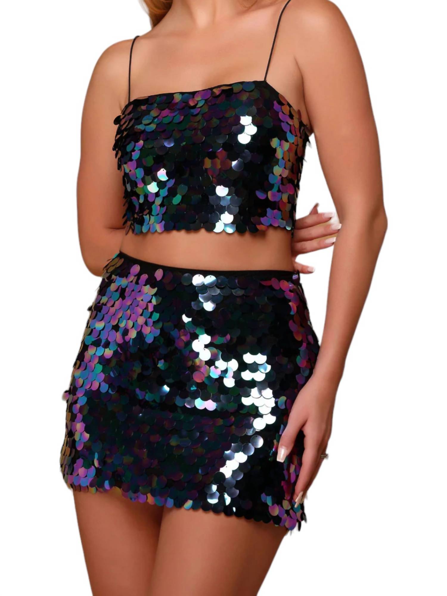 The perfect crop top for those warmer weather days.Sequined. Cropped length. Spaghetti strap. 100% Polyester.