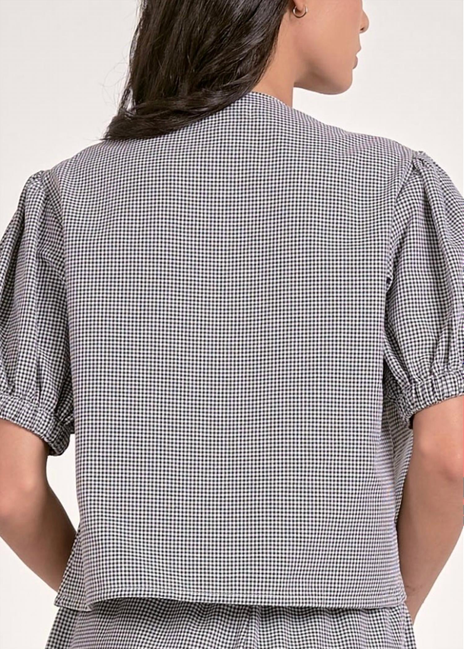 Elevate your spring wardrobe with the Wren Seersucker V-neck Blouse by ELAN, crafted from 100% breathable cotton in a chic gingham pattern. This blouse is designed with playful puff sleeves and features a short sleeve design that makes it ideal for warm-weather travels. It comes in a stylish black seersucker color and offers a convenient pull-on closure. For easy care, simply machine wash and tumble dry.