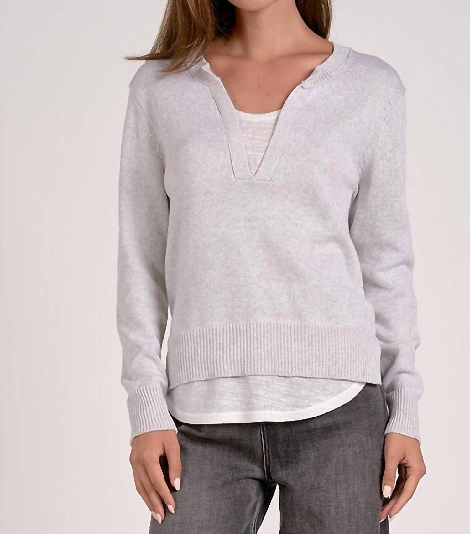 The ELAN V-neck Layered Sweater in Grey/White offers a sophisticated layered look with a textured pattern. Designed with long sleeves, this women's sweater is crafted from comfortable cotton, making it suitable for various seasons. Featuring a pull-on closure and a versatile V-neckline, it pairs effortlessly with any wardrobe ensemble. For care, simply hand wash as needed.