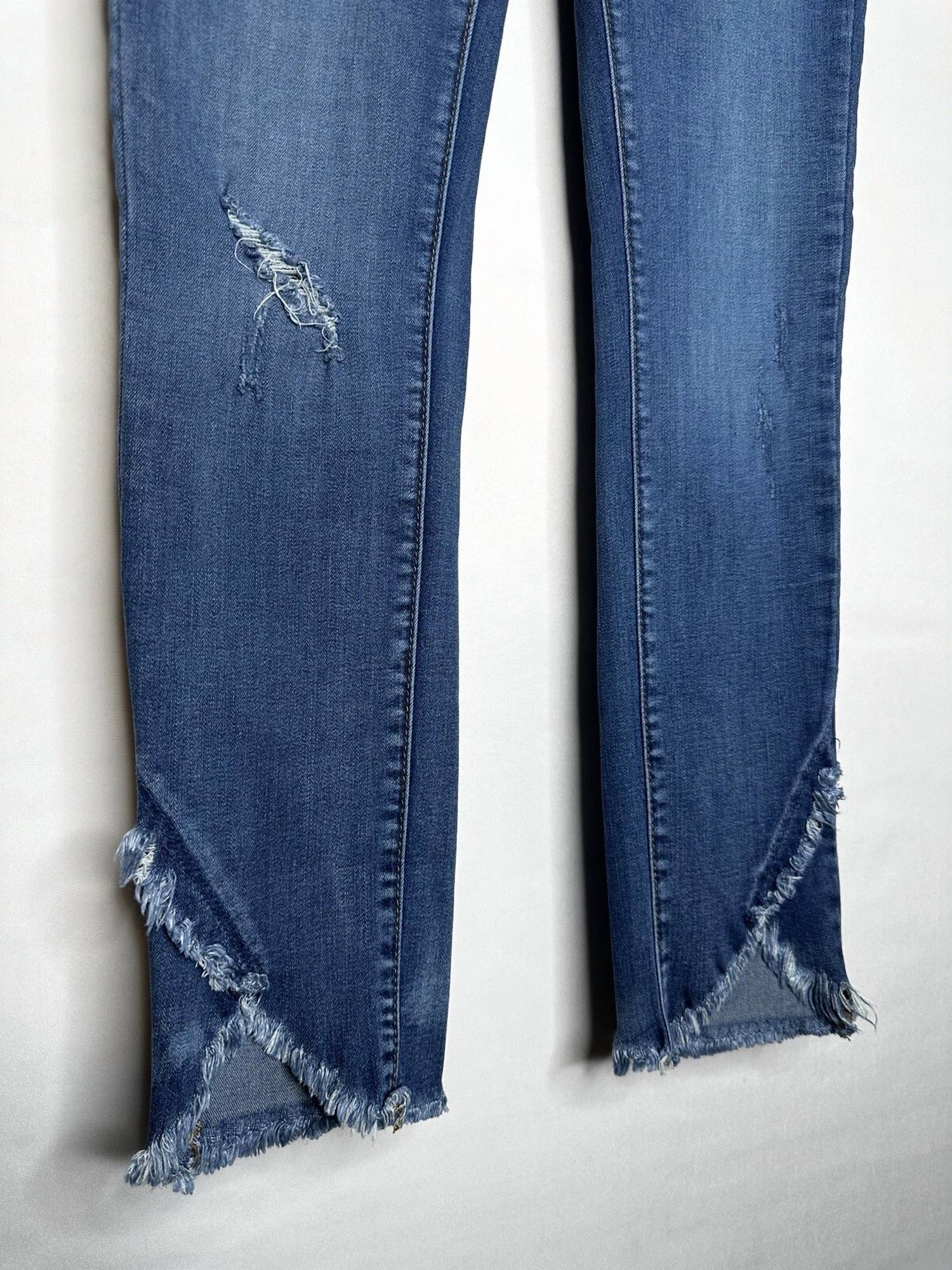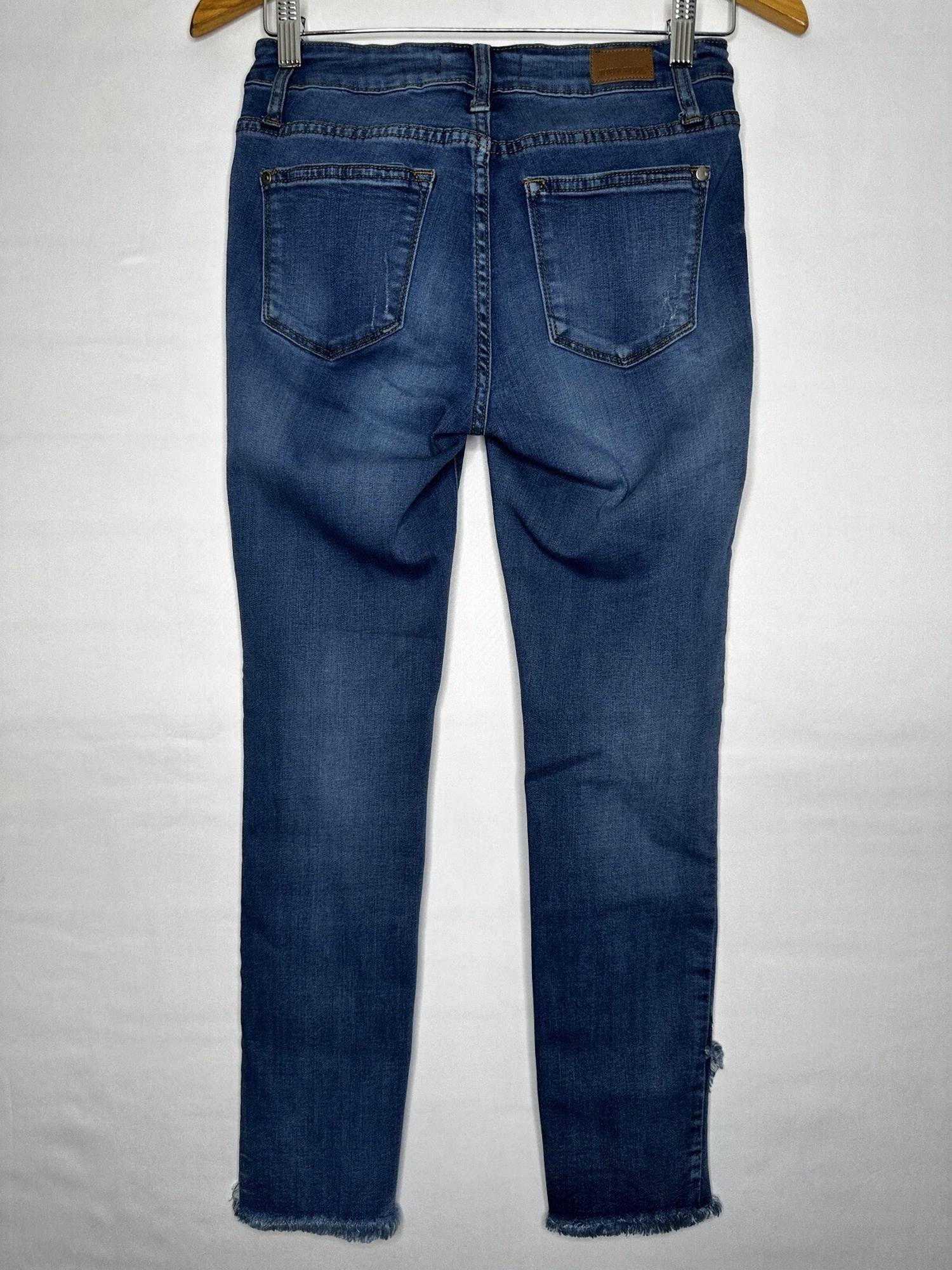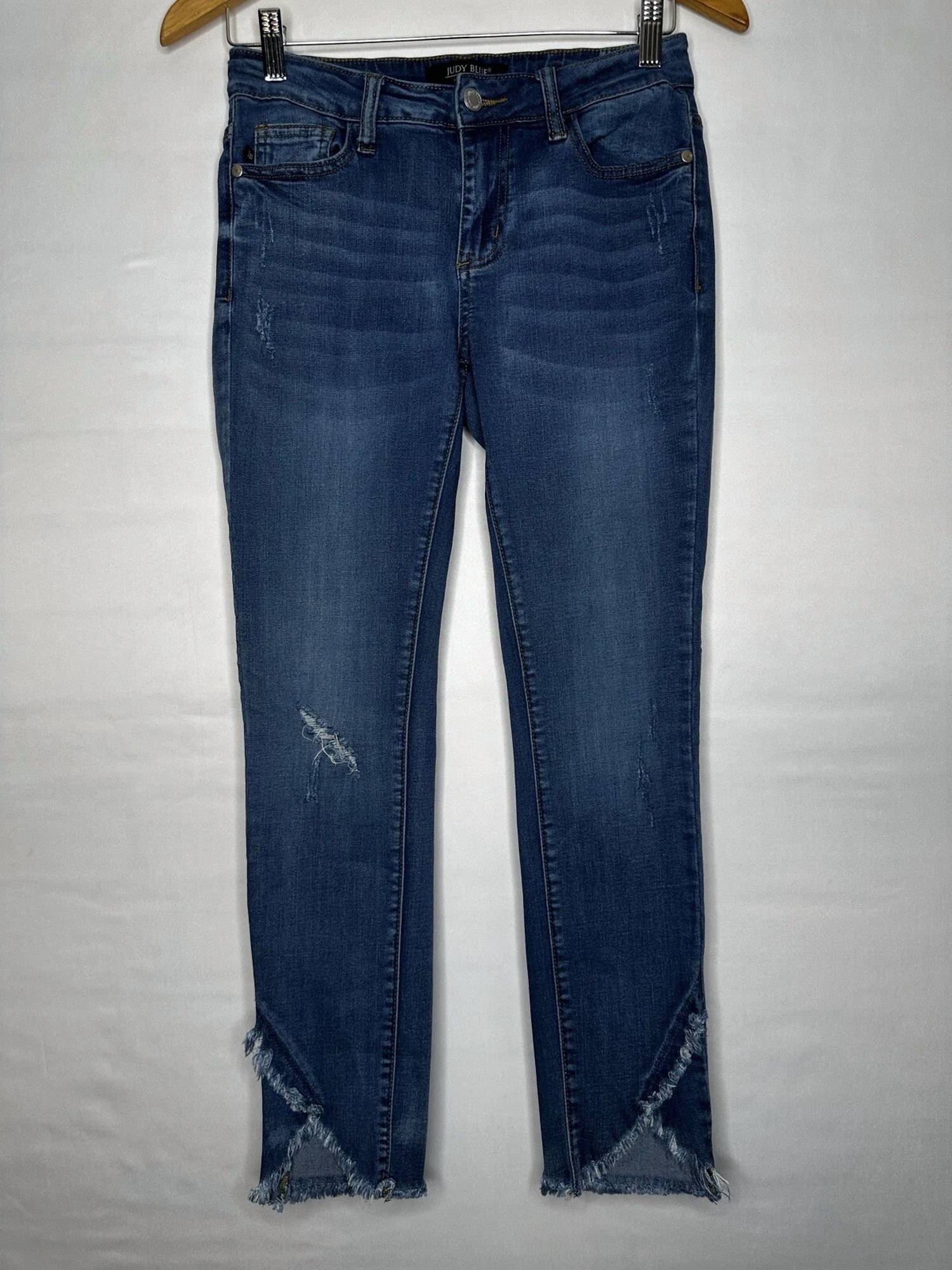 Introducing the Women's Tulip Cut Jeans by Judy Blue, a trendy medium blue denim option for any wardrobe. Crafted for a slim fit with a high-rise waist and featuring a flattering skinny leg, these jeans promise a chic silhouette. Made from a fabric blend of 75% cotton, 23% polyester, and 2% spandex, they ensure both comfort and durability. Designed with a zip closure, these jeans are easy to maintain with hand wash instructions and should be laid flat to dry.