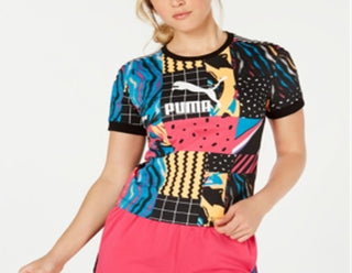 Puma Women's Clash Printed Cropped T-Shirt Black Size X-Large