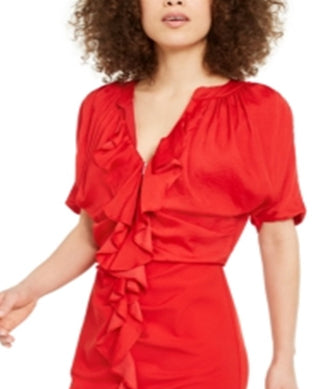 INC Women's Ruffled Ruched Dolman Sleeve V Neck Short Evening Body Con Dress Red Size 2XL