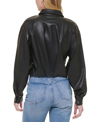DKNY Women's Ls Pu Hidden Button Front Cropped -Shirt Black Size X-Small