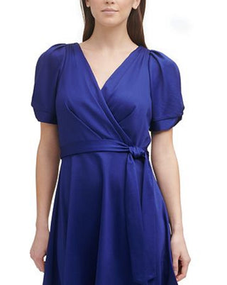 DKNY Women's Pleated Zippered Belted Unlined Short Pouf Knot-S Surplice Neckline Above The Knee Evening Fit Flare Dress Blue Size 12