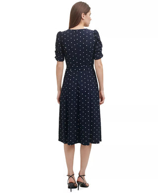 DKNY Women's Polka Dot Ruched Sleeve Midi Dress Blue Size 4Petite