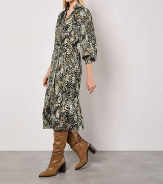 Apricot - Snakeskin Print Satin Shirt Midi Dress