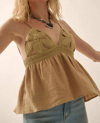 Promesa - Crinkle Cotton Floral Crochet Babydoll Cami Top