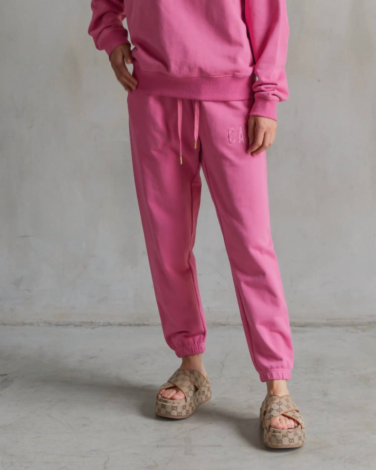The perfect pant for running around town and looking cool while doing it. Introducing the Care Classic Sweatpants by Care Tucker, a pink, solid track pant that offers ultimate comfort and streetwear style. With a relaxed fit and mid-rise elastic waistband featuring a functioning drawstring, these sweatpants are thoughtfully designed for women. Made from 100% premium organic cotton, they include functional side pockets and banded ankle cuffs for a tapered leg look. Care is easy with machine washing and tumble drying, ensuring these sweatpants get cozier with every wash. Wear them for travel or casual outings and feel good knowing 10% of the sale supports charities for teenage girls' mental health. Model is wearing size S/M (5'7" height, 34/B bust, 25" waist).