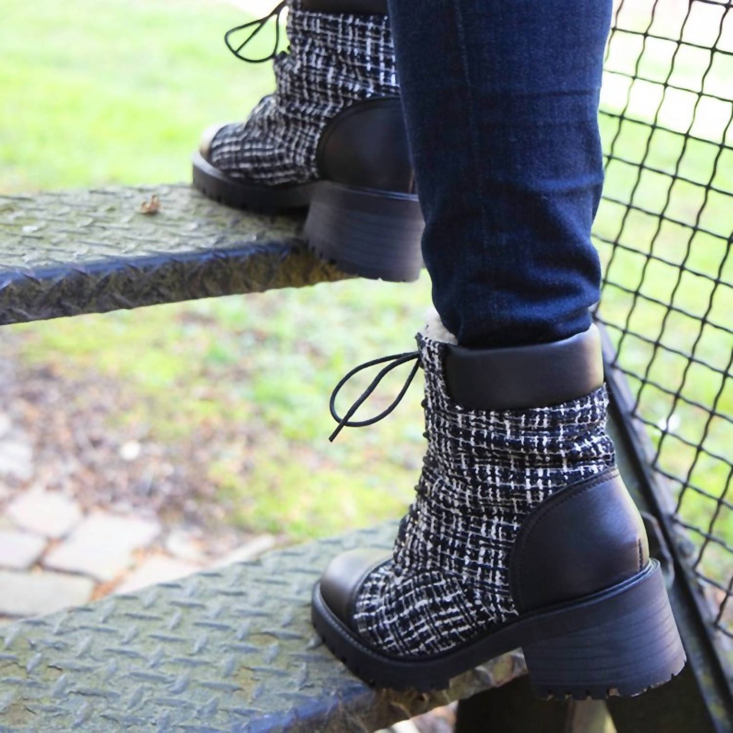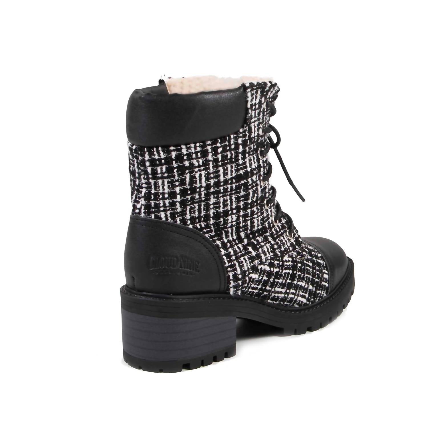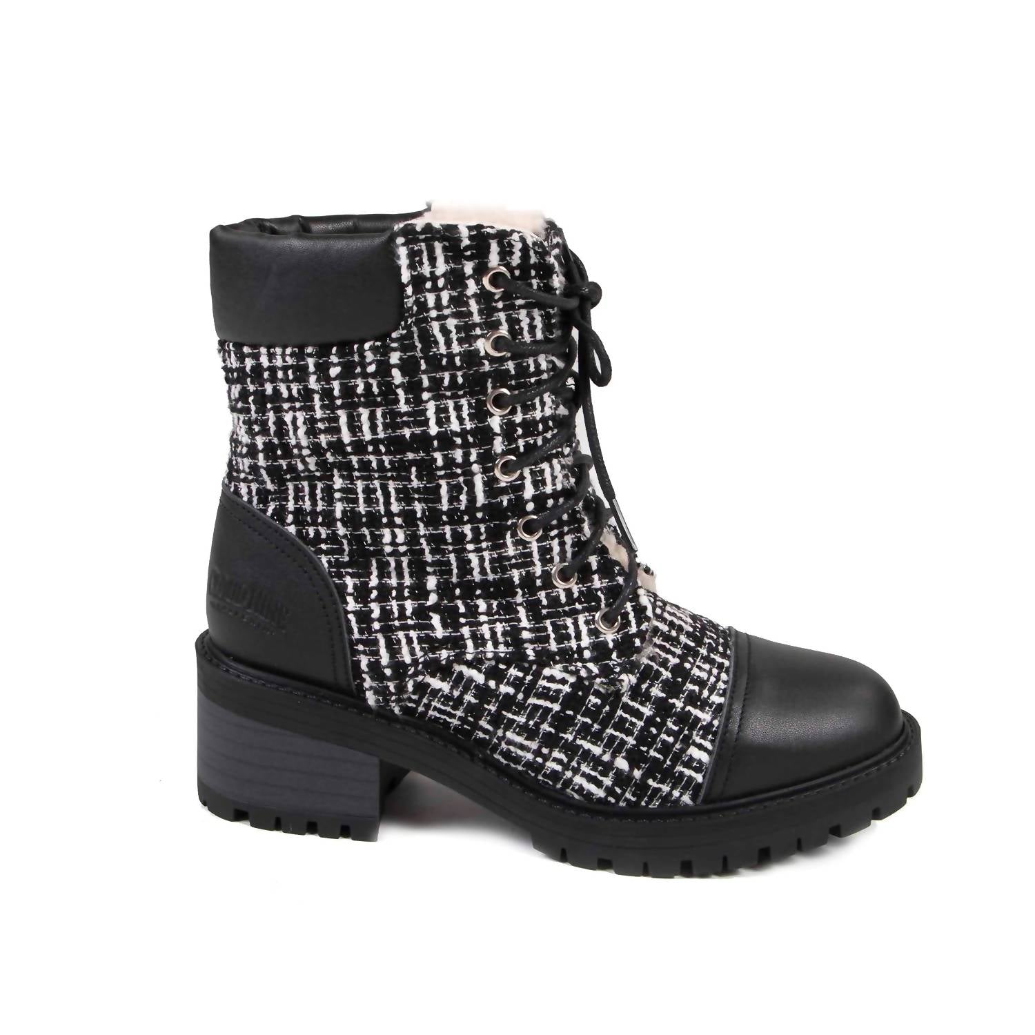 Upgrade your shoe game with these stylish lace-up boots, designed to merge sophistication and comfort. You'll be reaching for these shoes season after season. Step into style with the Women's Brooklyn Boot from CLOUD NINE, a chic option for your footwear collection. These standout sheepskin boots are designed with a leather and plaid synthetic upper, providing a unique look that will keep your feet warm and fashionable. Featuring a 100% sheepskin interior and TPR rubber sole, this boot ensures both comfort and durability.
