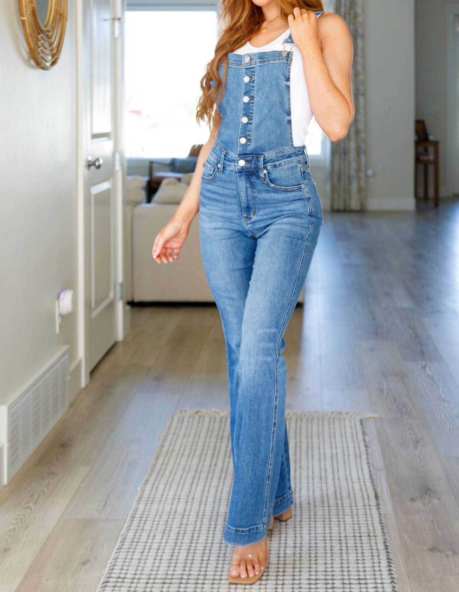 Wear these overalls any season by layering your favorite tank top or turtleneck underneath.Button up front bib overalls. Adjustable suspender straps. High rise flared bottoms. Tummy control technology. Zip Fly. 91% Cotton, 7% Polyester, 2% Spandex.