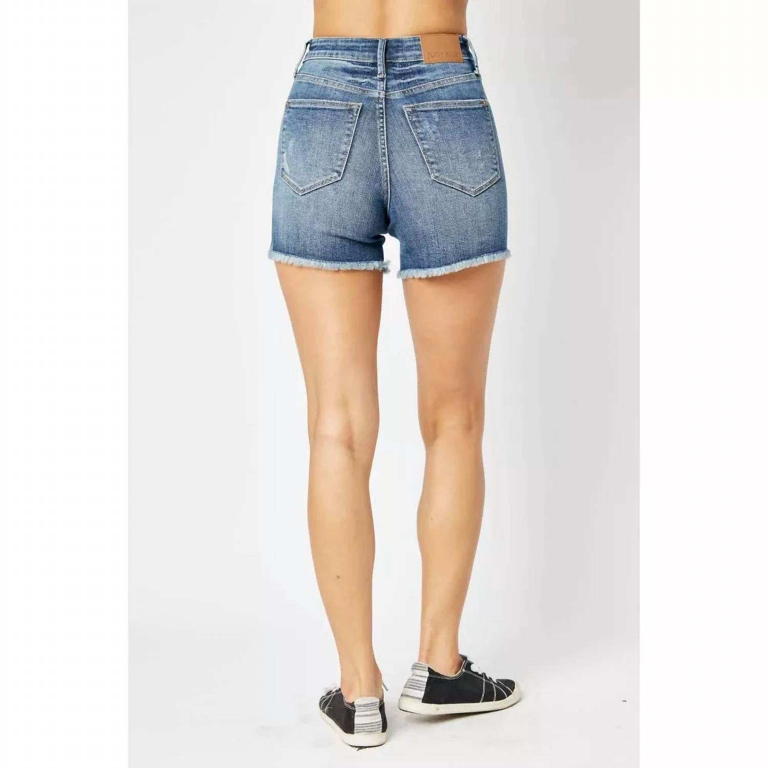 Explore effortless style and comfort with Judy Blue's Women's High Waist Tummy Control Fray Hem Shorts in Medium Wash Blue. Crafted from a stretchy blend of 91% Cotton, 7% Polyester, and 2% Spandex, these mid-thigh shorts boast tummy control panels for a sleek silhouette. The button closure and solid design, combined with a frayed hem, add a touch of edginess to your look. Available in sizes S to 3X, these shorts are a wardrobe must-have for both casual and chic outfits. Ashley, the model pictured, wears a size 1X with a 30-inch inseam to the ankle.