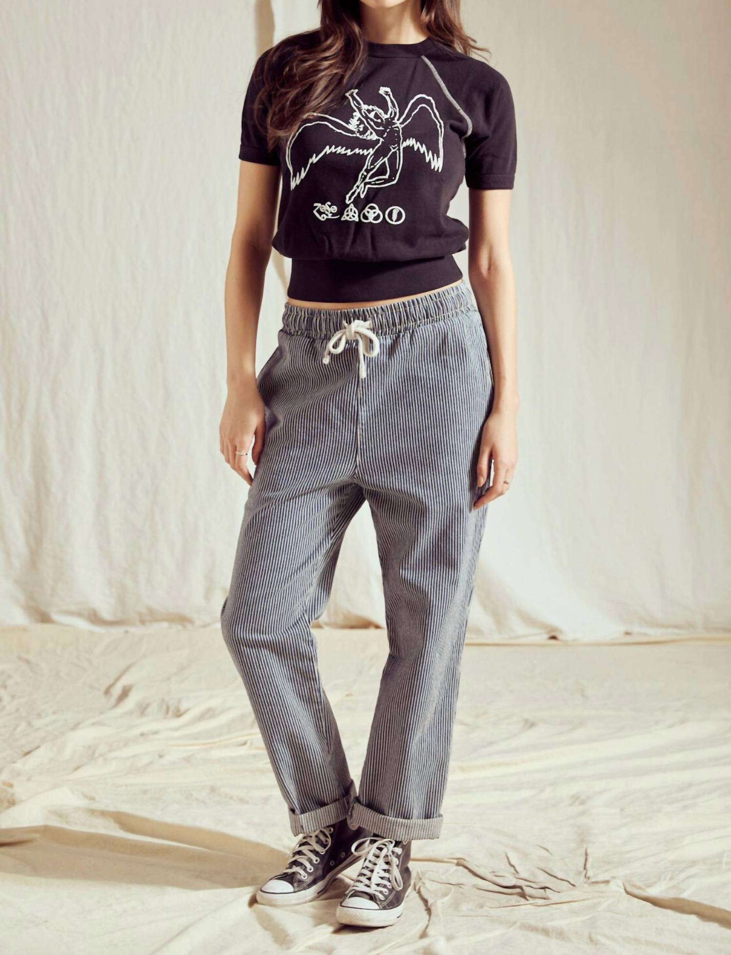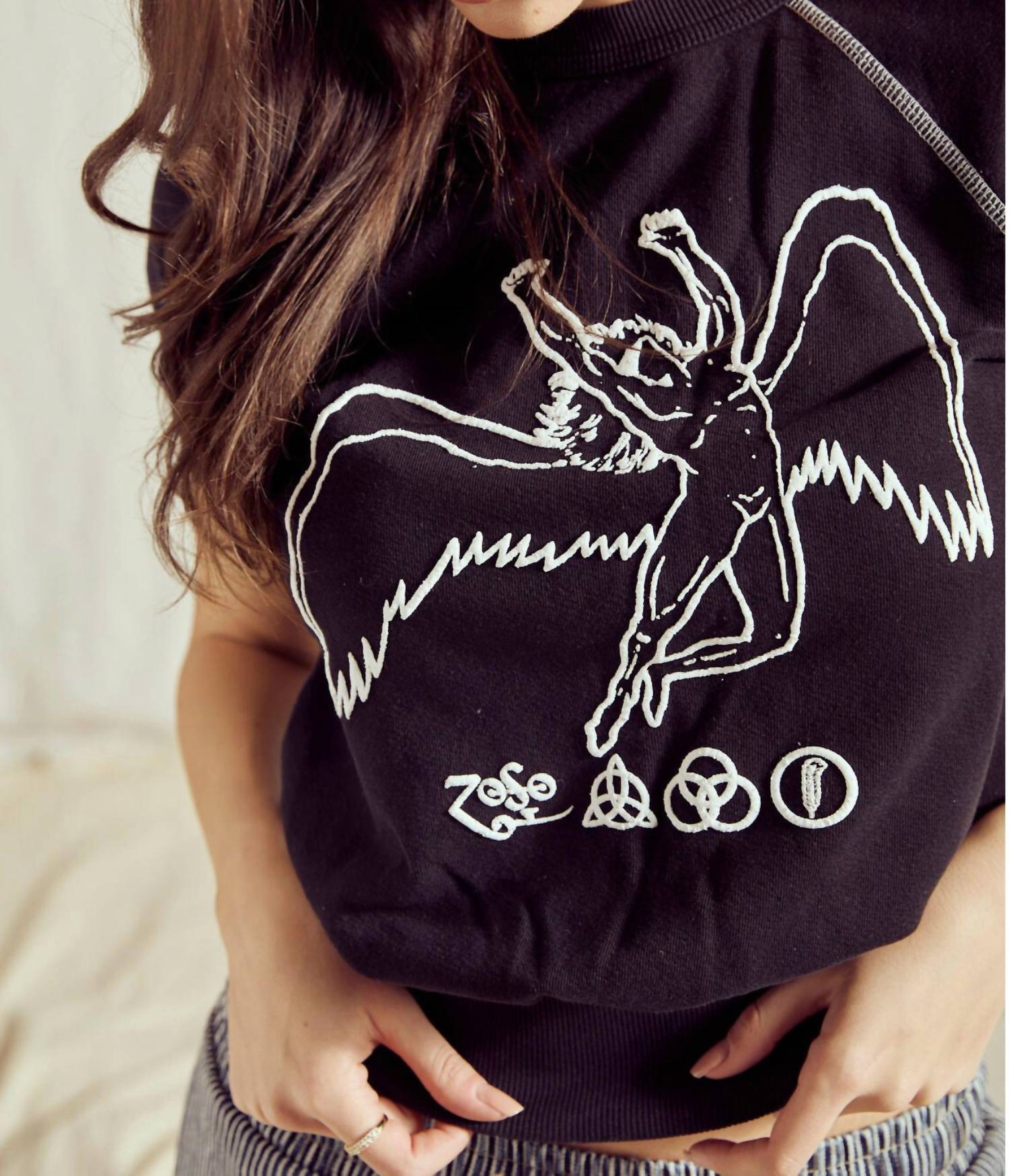 Celebrate your love for rock legends with the Led Zeppelin Short Sleeve Icarus Raglan by People of Leisure. This black, graphic tee features short sleeves and showcases the iconic Icarus logo alongside each band member's symbol, with their last names boldly printed on the back. Ethically made in Los Angeles, this crewneck tee is crafted from 100% cotton for comfort. Care for this timeless piece with a machine wash, and tumble dry on low. Available in sizes S-XL.