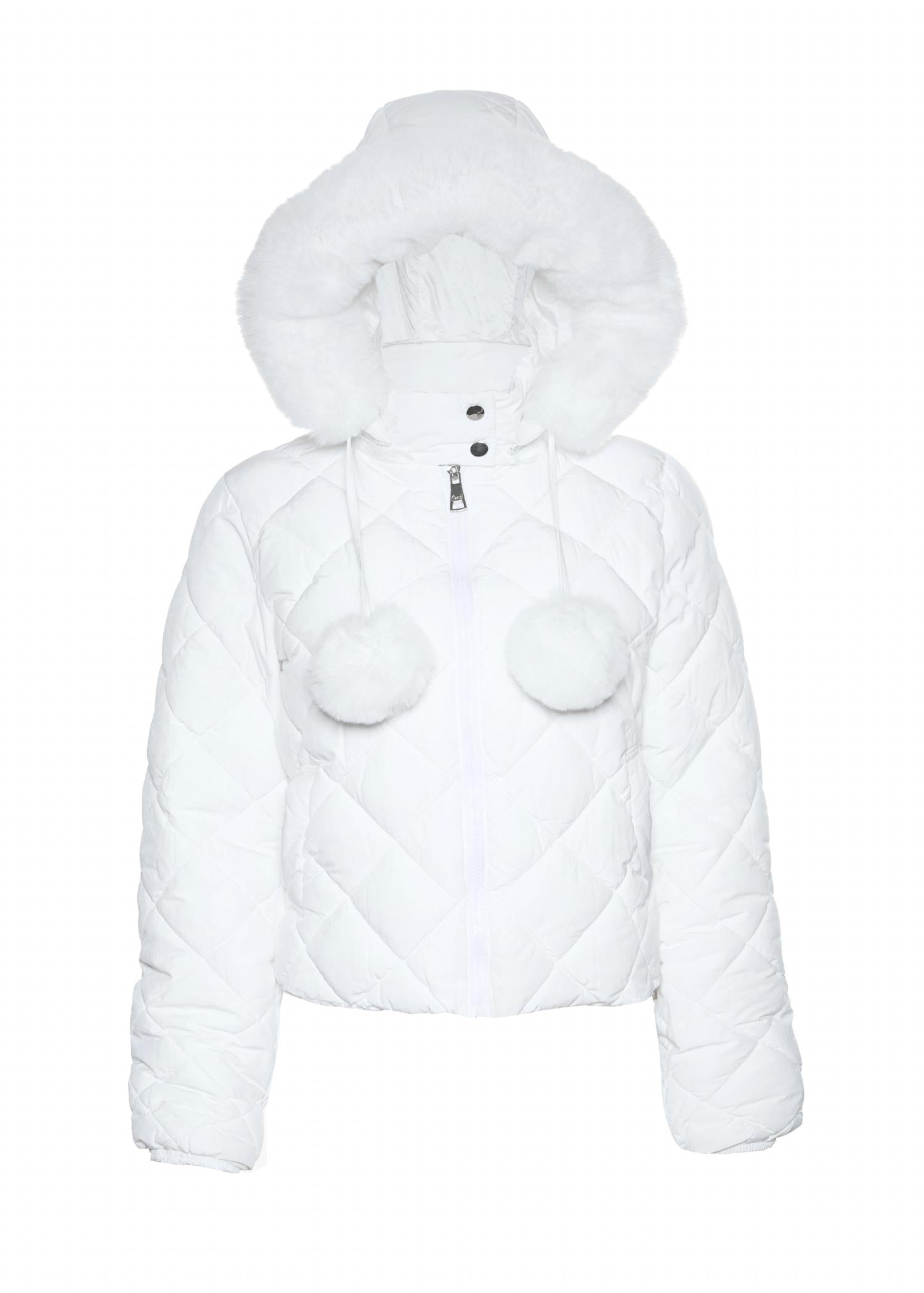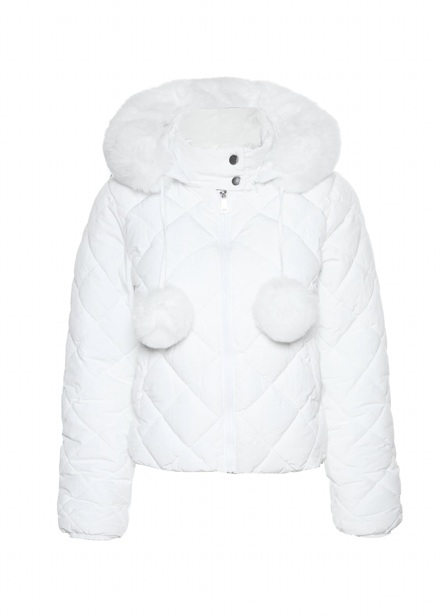 Cozy, cute and timeless. The puffer jacket that will keep you warm all season long. With its long sleeves, textured pattern, and vibrant white color, it's perfect for making a bold fashion statement. The jacket features a zip closure and comes with a removable hood and adjustable cords at the waist and hem for a personalized fit. Designed for women, this jacket also includes pockets and boasts high-quality insulation to ensure you stay warm in all weather conditions.