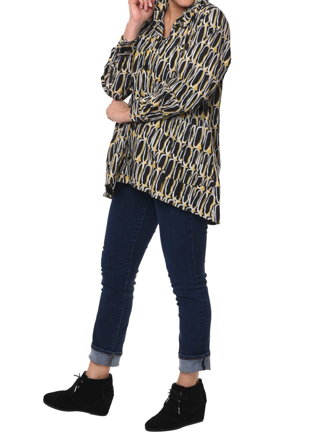 Introducing the Dorian Button Down Blouse by Tulip Clothing, a chic piece in the striking Olive Oil shade perfect for a Spring wardrobe. Crafted from 100% cotton, this long-sleeved blouse features a unique tube collar, graphic pattern, and functional front patch pockets. With a garment length starting at 28" for size XS and a back extending 4" longer, it offers a roomy fit with button closure. Easy to care for, this blouse requires a machine wash in cold water and line drying to maintain its pristine look. Front Center Length XS 28", S 28 1/2", M 29", L 29 1/2", XL 30". Chest XS 42", S 44", M 46", L 48", XL 50".