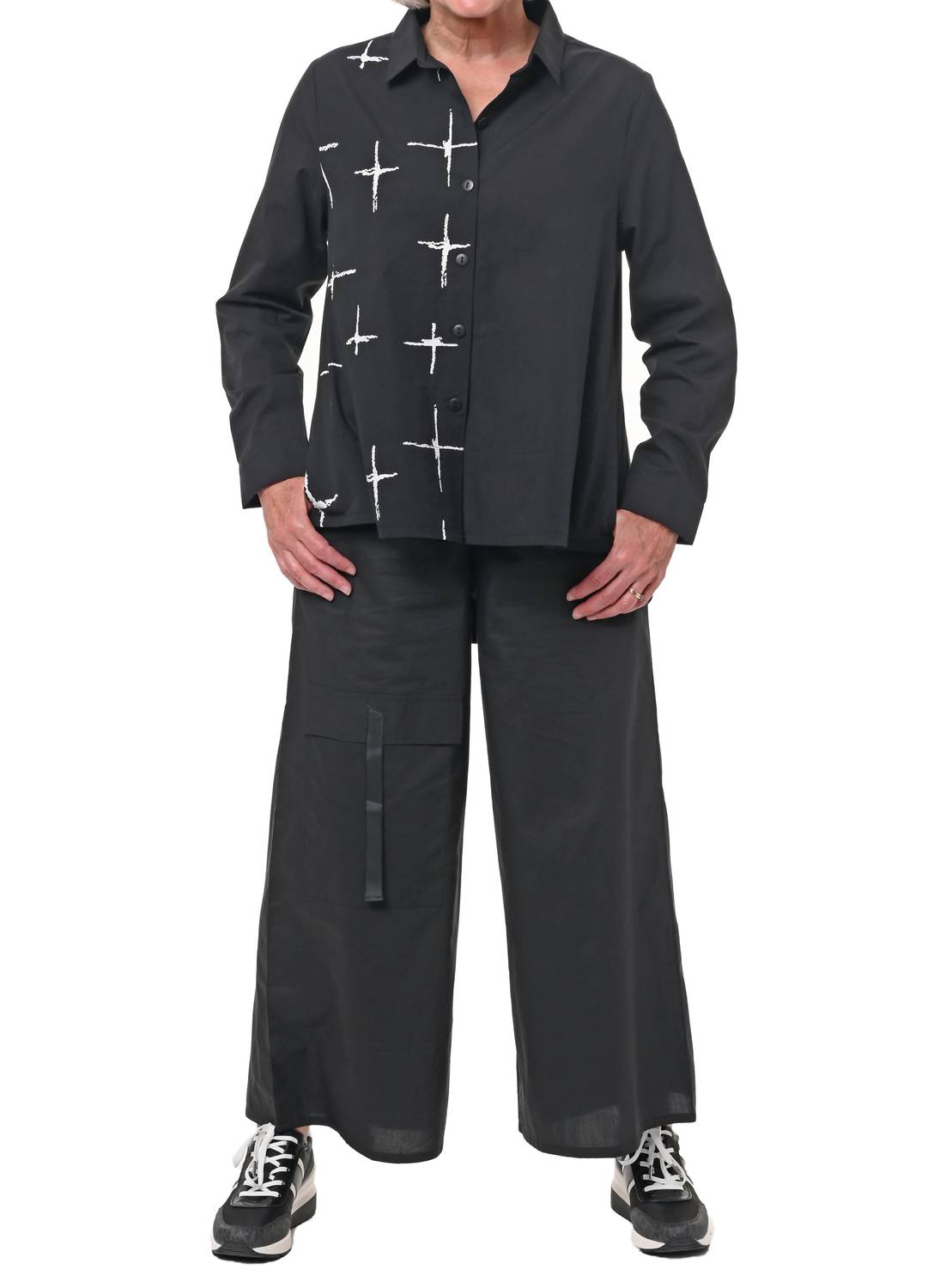 Discover the Farrah Button Down Shirt by Tulip Clothing, an exquisitely designed piece in a standout Black Galaxy print. This long-sleeved shirt combines solid black and a black/white graphic print seamlessly, featuring side seam pockets, a back pleat, and buttoned cuffs for added flair. Made from 100% cotton, this shirt comes with a button closure and is easy to care for with machine wash and line dry instructions. The garment length starts at 24.5" in size XS, extending to 27" in size XXL, with chest measurements spanning from 42" to 52". Model is wearing a size small. Front Center Length XS 24 1/2", S 25", M 25 1/2", L 26", XL 26 1/2", XXL 27". Back Center Length XS 29 3/4", S 30 1/4", M 30 3/4", L 31 1/4", XL 31 3/4", XXL 32 1/4". Chest XS 42", S 44", M 46", L 48", XL 50", XXL 52".