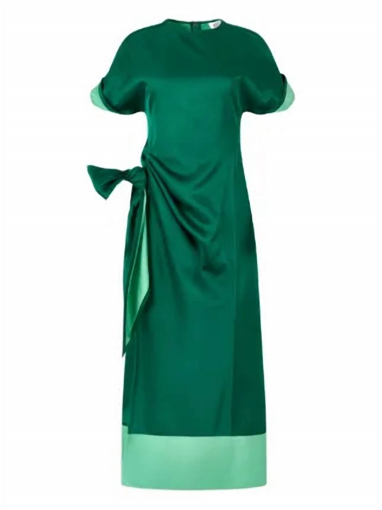 Just add slides or mules and you are good to go. Introducing the Sash & Slit Dress by Rosie Assoulin, a stunning choice for any dinner party or special occasion. Expertly crafted with short sleeves and a viscose blend, this sheath dress features a flattering cinched waist with an attached sash detail. Designed in a rich emerald shade, the dress is crafted from 50% Viscose and 50% Polyester, offering both fluidity and a luminous sheen. A tasteful slit paired with a contrasting hem elevates the elegance, while a zip closure ensures a secure fit.